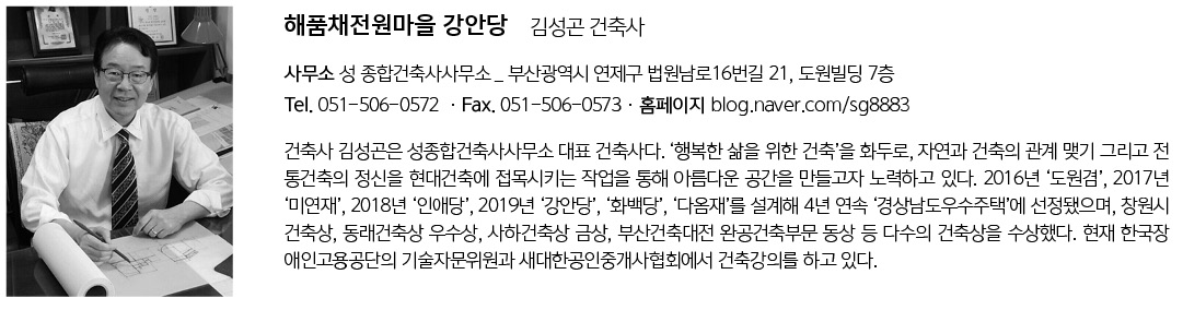 | 해품채전원마을 강안당 설계자 | 김성곤_성 종합건축사사무소 건축주 | 이정윤, 김철우 감리자 | 김성곤 _ 성 종합건축사사무소 시공사 | 이정윤, 김철우(건축주직영) 설계팀 | 남충헌 대지위치 | 경상남도 고성군 동해면 조선특구로 1753-12 주요용도 | 단독주택 대지면적 | 1,746.00㎡ 건축면적 | 225.09㎡ 연면적 | 191.81㎡ 건폐율 | 12.89% 용적률 | 10.99% 규모 | 지상 2층 구조 | 철근콘크리트조 외부마감재 | 스타코, 씨블랙버너구이 내부마감재 | 대리석, 실크벽지 설계기간 | 2018. 03 ~ 2018. 05 공사기간 | 2018. 10 ~ 2019. 10 사진 | 성 종합건축사사무소 전문기술협력 - 구조분야 : 원구조 - 기계설비분야 : 올엔지니어링 - 전기분야 : 올엔지니어링 - 소방분야 : 올엔지어링 |