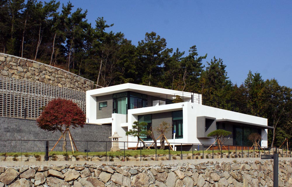 Appearance & Color Considering the stepped topography of the land, it has a simple and modern design with horizontal stability. The color is a simple contrast between white and gray. The architecture is made by limiting colors to achromatic colors. And nature, human beings, and interior accessories add colors to space and architecture.