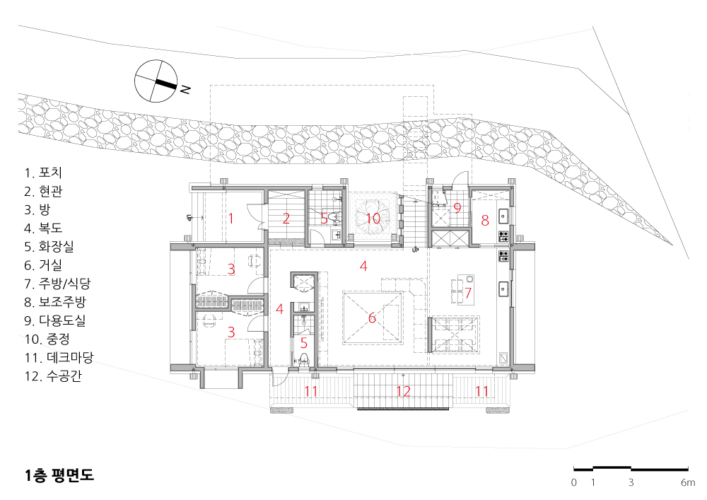 평면은, 부지의 형상과 주변 환경 그리고 전망을 고려해 외부지향형으로 하고 실내중정으로 빛과 홍단풍의 자연을 들인다. 거실과 다이닝룸의 공용공간은, 전망 좋은 동쪽의 바다와 들판으로 향하고, 1층과 2층의 방들은 남향이다. 서쪽으론 개구부가 없고, 북쪽으론 계단과 다용도실 등의 공용공간을 배치해 에너지 절감을 고려했다. 2층으로 오르는 직통계단 천장엔 원형천창을 설치해 밤으론 별빛을, 낮으론 자연채광을 선물한다.