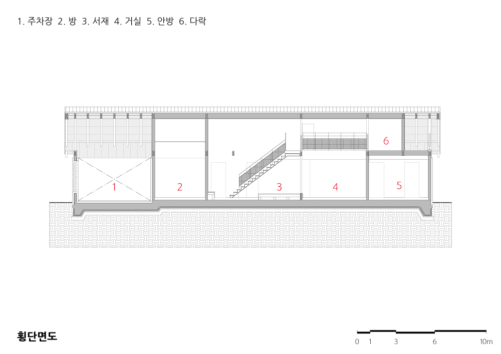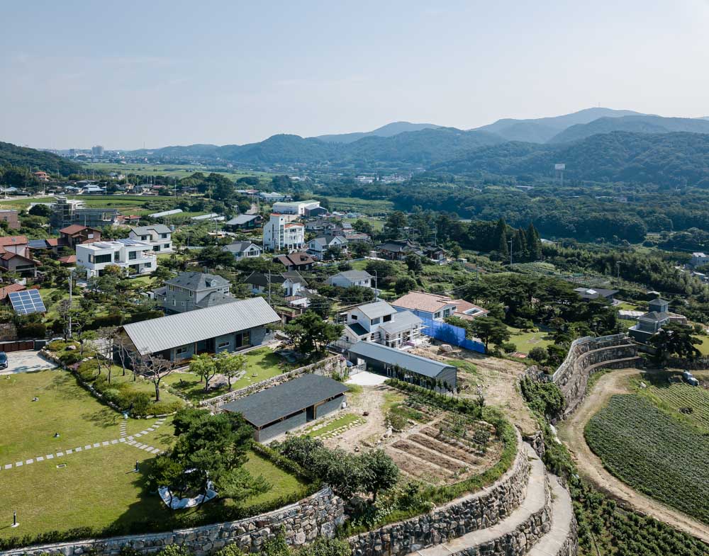 부부가 사는 단층 주택 1동, 농사를 짓고 농기구를 보관할 창고 1동으로 이루어진 주택을 지었다. 집은 남쪽의 마당과 풍경을 향해 활짝 열려 있다. 마당 앞으로 그림 같은 산세가 펼쳐진다. 날씨 좋은 날, 노부부가 시간을 가장 많이 보내는 곳은 서재와 연결된 외부 대청이다. 대청 위로 목구조가 드러난 처마는 해를 적절히 가려주고, 비가 오는 날에는 떨어지는 빗물을 보며 쉴 수 있는 아늑한 외부공간을 만들어준다. 외부 공간과 거실, 툇마루에서 연결된 남쪽 마당은 양옆의 석축과 건물로 둘러싸인 아늑한 두 부부의 공간이다. 마당은 인공적인 재료가 아닌 돌과 잔디, 나무로 이루어져 있다. 노부부는 맨발로 걸어 나와 돌 벤치 위 그늘에 앉아 커피를 마시곤 한다. 마당을 지나 조금 내려가면 창고와 밭이 있다. 노부부는 작은 밭을 일구며 시간을 보내고, 수확한 농작물을 저녁밥상에 놓기도 한다. 농기구를 보관하는 창고는 단층 주택과 마찬가지로 중목 구조를 응용한 구조와 시멘트 블록으로 쌓여진 벽 사이로 바람이 자유로이 드나든다. 창고와 마당은 대지의 고저차를 이용하여 주택에서의 시야를 방해하지 않으며, 조화롭게 어울린다. 집의 입구를 들어서면 목구조가 드러난 주차장이 보인다. 5미터를 넘게 가로지르는 목구조와 영롱 쌓기로 쌓아진 주차장 벽면이 눈에 띈다. 주차장을 지나 현관으로 들어서면 눈높이의 창이 액자처럼 처마와 마당, 산의 풍경을 한눈에 담고 있다. 경치를 담는 집안의 창들은 다양한 크기와 모양으로 바깥의 똑같은 풍경을 저마다 다르게 담는다. 마루를 올라서면 노출된 보 위로 높은 천장이 시원하다. 기둥과 보 구조인 중목 구조로 이루어졌기 때문에 큰 개구부가 가능하였고, 개방감을 가질 수 있었다. 또한 기둥과 보, 장선은 그대로 노출되어 집에 구조미를 더하고 공간을 구획하기도 한다.