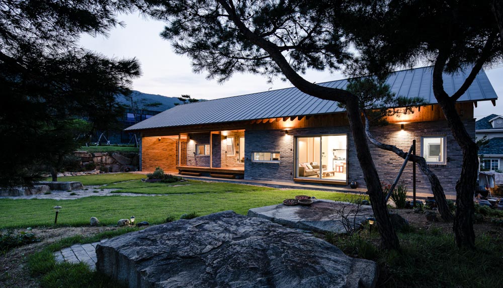 This site, where known as the historic place in Korea, is covered with layers of mountains. The old couple who decided to settle down here planned 2 units of house, 1 story building for house and 1 story storage for farming utensils. The house, Simple and long-shaped, is composed of brick wall and wooden roof. Also, as the house open to the southern yard and landscape, picturesque scenery unfolded before eyes. Roof with exposed timber structure acts as sunshade. On rainy day, raindrops can be seen in cozy outdoor space. The yard covered with the stone wall and the building becomes a precious family space to the husband and wife. There is a storage and a field apart from the yard. The old couple goes to farm and enjoy their crops. The storage also consists of timber structure and finished by cement blocks. Storage and yard mingle with each other harmoniously by using difference of elevation, not interrupting a sight. Over time, house and old couple would take after each other.