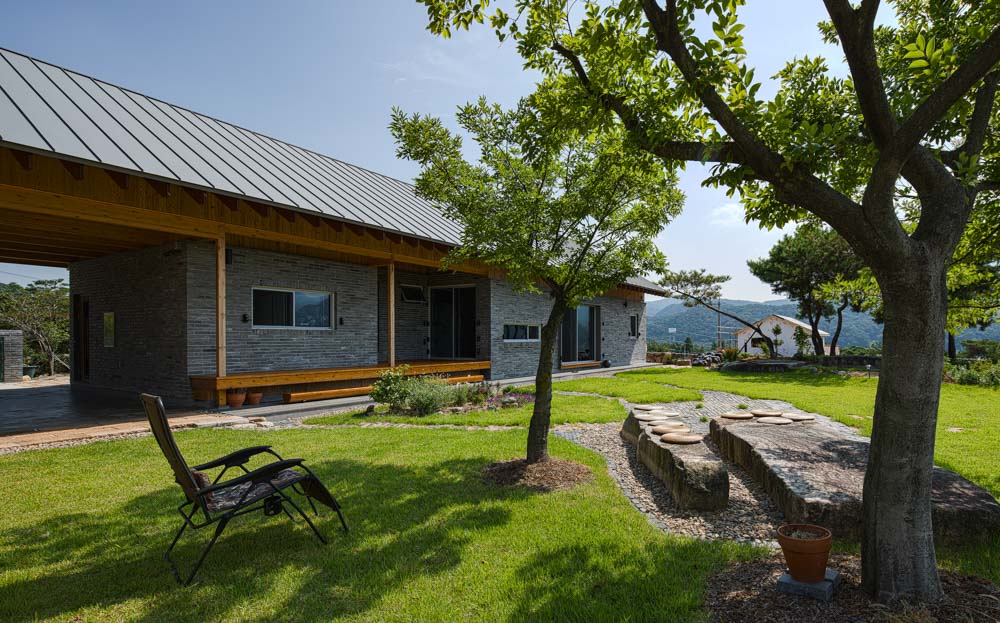 부부가 사는 단층 주택 1동, 농사를 짓고 농기구를 보관할 창고 1동으로 이루어진 주택을 지었다. 집은 남쪽의 마당과 풍경을 향해 활짝 열려 있다. 마당 앞으로 그림 같은 산세가 펼쳐진다. 날씨 좋은 날, 노부부가 시간을 가장 많이 보내는 곳은 서재와 연결된 외부 대청이다. 대청 위로 목구조가 드러난 처마는 해를 적절히 가려주고, 비가 오는 날에는 떨어지는 빗물을 보며 쉴 수 있는 아늑한 외부공간을 만들어준다. 외부 공간과 거실, 툇마루에서 연결된 남쪽 마당은 양옆의 석축과 건물로 둘러싸인 아늑한 두 부부의 공간이다. 마당은 인공적인 재료가 아닌 돌과 잔디, 나무로 이루어져 있다. 노부부는 맨발로 걸어 나와 돌 벤치 위 그늘에 앉아 커피를 마시곤 한다. 마당을 지나 조금 내려가면 창고와 밭이 있다. 노부부는 작은 밭을 일구며 시간을 보내고, 수확한 농작물을 저녁밥상에 놓기도 한다. 농기구를 보관하는 창고는 단층 주택과 마찬가지로 중목 구조를 응용한 구조와 시멘트 블록으로 쌓여진 벽 사이로 바람이 자유로이 드나든다. 창고와 마당은 대지의 고저차를 이용하여 주택에서의 시야를 방해하지 않으며, 조화롭게 어울린다. 집의 입구를 들어서면 목구조가 드러난 주차장이 보인다. 5미터를 넘게 가로지르는 목구조와 영롱 쌓기로 쌓아진 주차장 벽면이 눈에 띈다. 주차장을 지나 현관으로 들어서면 눈높이의 창이 액자처럼 처마와 마당, 산의 풍경을 한눈에 담고 있다. 경치를 담는 집안의 창들은 다양한 크기와 모양으로 바깥의 똑같은 풍경을 저마다 다르게 담는다. 마루를 올라서면 노출된 보 위로 높은 천장이 시원하다. 기둥과 보 구조인 중목 구조로 이루어졌기 때문에 큰 개구부가 가능하였고, 개방감을 가질 수 있었다. 또한 기둥과 보, 장선은 그대로 노출되어 집에 구조미를 더하고 공간을 구획하기도 한다.