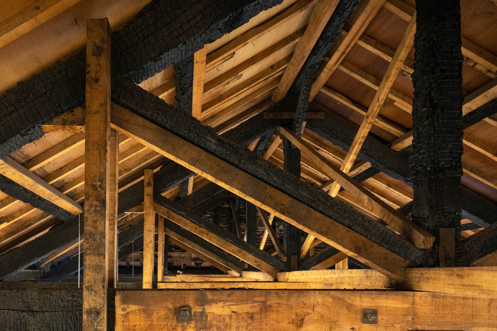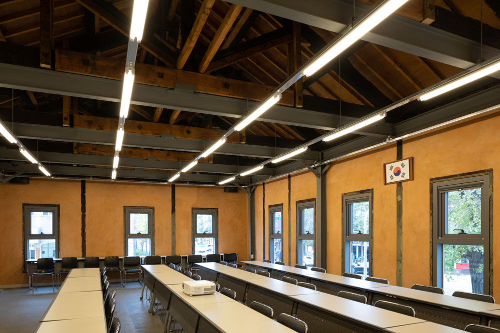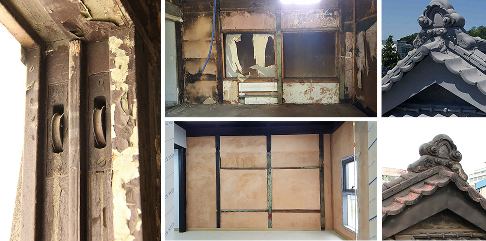 The exterior is restored according to the image provided by former Professor Son Jang-won of JEI University, and the interior is designed to show wooden trusses and the traces of the fire. The charred part has been renovated to match the color of reinforced timbers with the yellow core wall of the interior walls so that the traces of time are apparent everywhere.