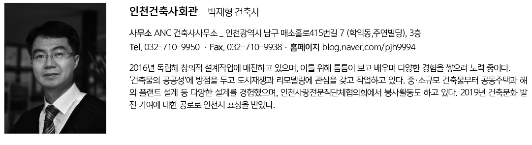 | 인천건축사회관 설계자 | 박재형 _ ANC 건축사사무소 건축주 | 인천광역시건축사 상조복지회 감리자 | 박재형 _ ANC 건축사사무소 시공사 | 김덕호 _ (주)현대특수건설 설계팀 | 이미선 대지위치 | 인천광역시 중구 제물량로 203-1 주요용도 | 근린생활시설 대지면적 | 227.80㎡ 연면적 | 330.63㎡ 용적률 | 145.14% 규모 | 지상 2층 구조 | 목조, 철근콘크리트조 외부마감재 | 창호 - 경원알미늄, 로이복층유리 벽 - 보현석재, 에어로 사이딩 플러스 ST110 지붕 - 온새미로, 단열페인트 내부마감재 | 황토몰탈, 지정벽지 설계기간 | 2019. 06 ~ 2019. 07 공사기간 | 2019. 06 ~ 2019. 09 사진 | 김재경, 박재형 전문기술협력 - 구조분야 : 빛과울 구조컨설팅 - 기계설비분야 : (주)비상이엔씨 - 전기분야 : (주)비상이엔씨 |