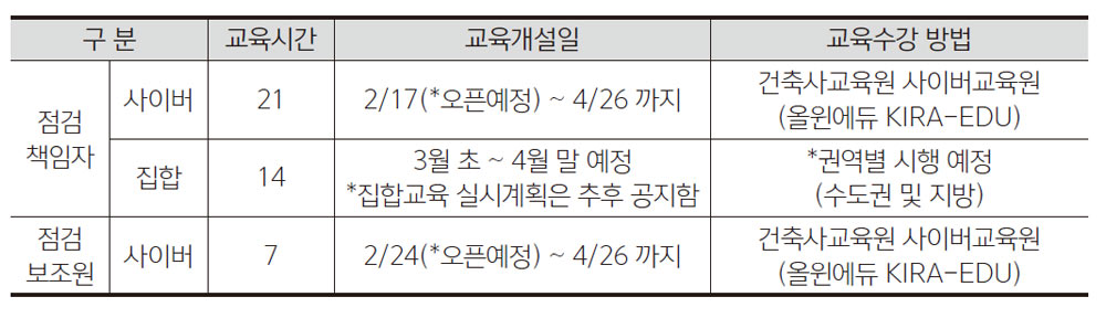 협회에서는 법률 시행 이전에 건축물관리점검 관련 법정교육을 실시해 법 시행 직후 건축사가 건축물관리점검 업무를 하고자 하는 경우에 대비하고자 교육을 진행한다. 총 이수 교육시간은 35시간으로 2월 17일부터 4월 26일까지 사이버 및 집합교육으로 진행되고, 집합교육의 경우 권역별로 협회 주관 순회교육이 실시될 예정이다. 교육 관련 문의는 전화 02)3415-6856∼8, 02)3415-6878∼9로 문의하면 된다.