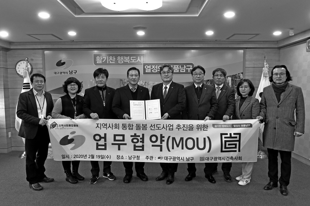 대구광역시건축사회는 2월 19일 대구광역시 남구청과 최첨단 무장애주택 설계 및 장애인 주거환경 개선사업 컨설팅에 관한 업무협약을 체결했다.