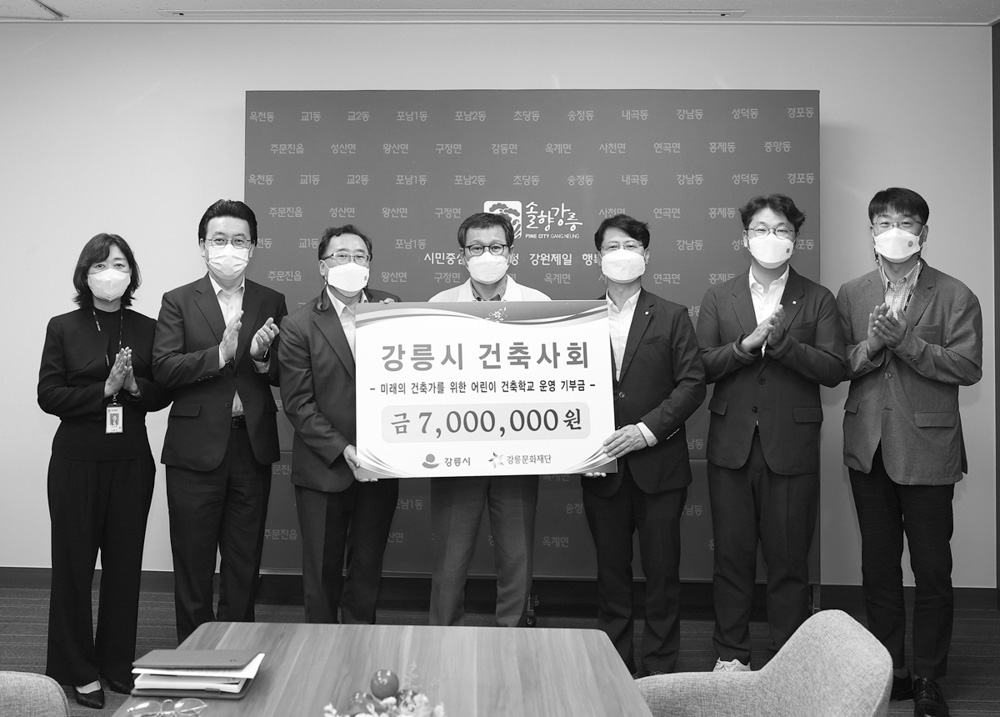 강원도건축사회 강릉지역건축사회는 9월 5일 강릉시청을 방문해 어린이 건축학교 운영비와 건축문화 확산을 위해 700만 원을 기부했다. 조정희 강릉지역건축사회장은 이 자리에서 “지역의 건축문화 발전과 확산에 기여하는 강릉지역건축사회가 되도록 노력을 이어 나갈 것”이라고 밝혔다.