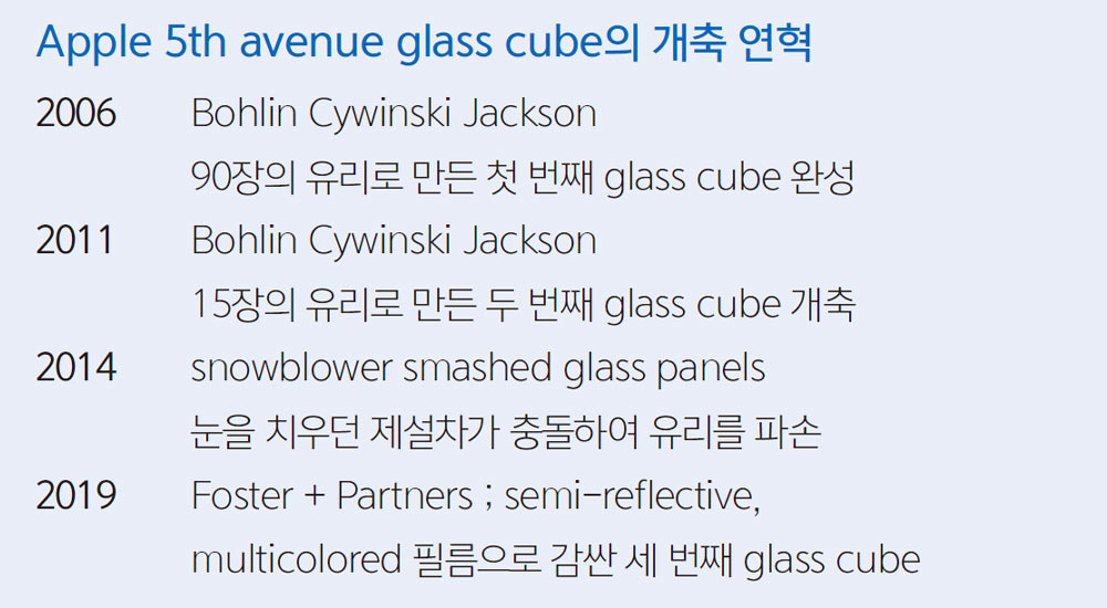 「애플」 입장에서는 많이 속상했을 것이다. 2006년 첫 번째 glass cube를 완성하고, 겨우 5년 만인 2011년에 개축했는데, 개축 2년 뒤에 제설차 충돌 사고로 유리가 깨졌기 때문이다. apple 5th avenue glass cube의 개축 과정은 이렇다.