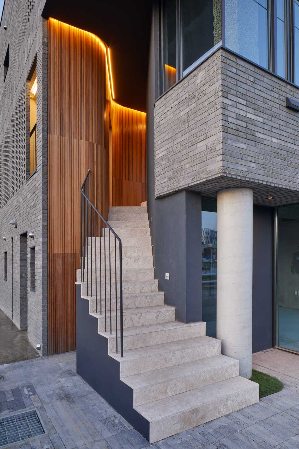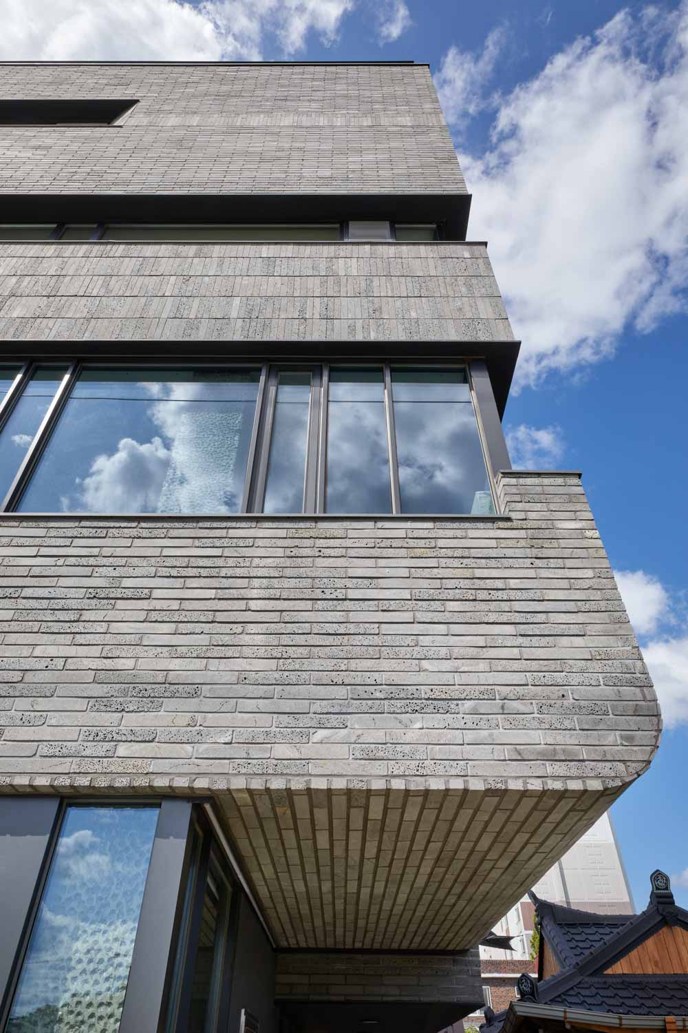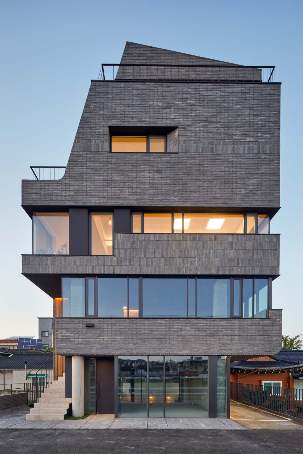 Compared to the small scale of neighboring houses, the required five-story volume could be too massive. We wanted to divide the volume as much as possible horizontally to scatter the shape. The volume was divided deeply and thickly, and the parts that could not be divided for the functions were made loose through ‘hit and miss’ brickwork. The brick's horizontal and vertical patterns were used to divide the bricks into smaller pieces using horizontal and vertical lines, but the stacking bricks completely distinguish brick texture from horizontal patterns through minimizing masonry joint. The curve section of bricks is designed to feel soft and warm as if the divided volume reacted to the wind of the river. Using sleek metal flashing, deep shade is added to the horizontal void, and the windows are vertically framed to make the building rhythmic.