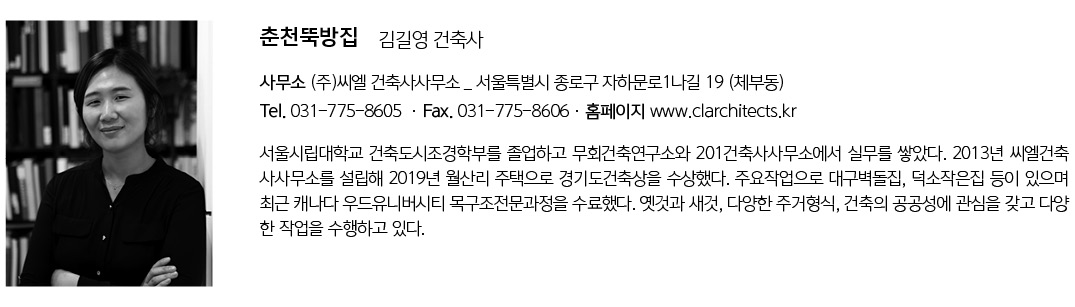 I hope that a neat, simple yet a little scattered house has been added to the slow landscape of Ttukbanggil in Chuncheon.