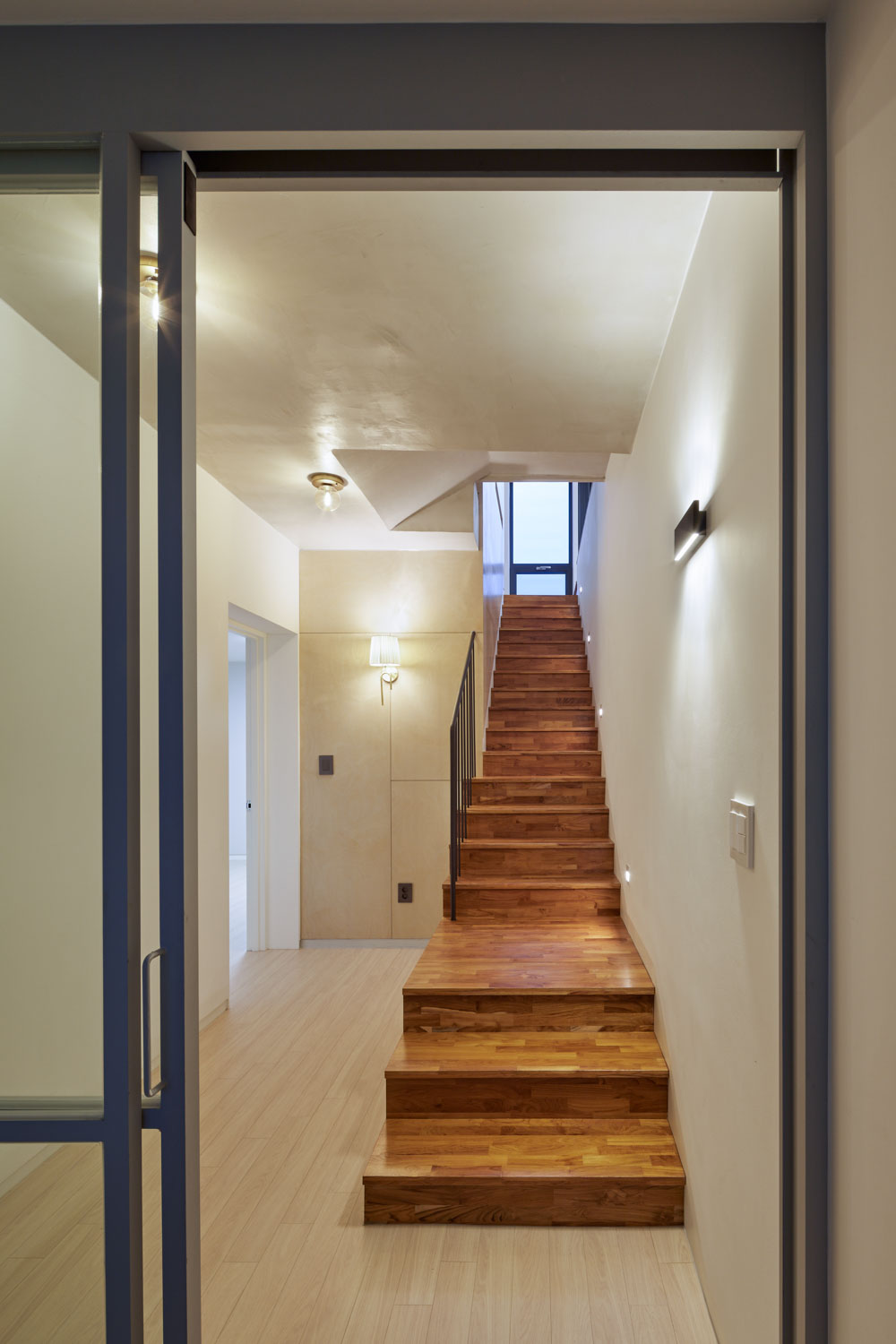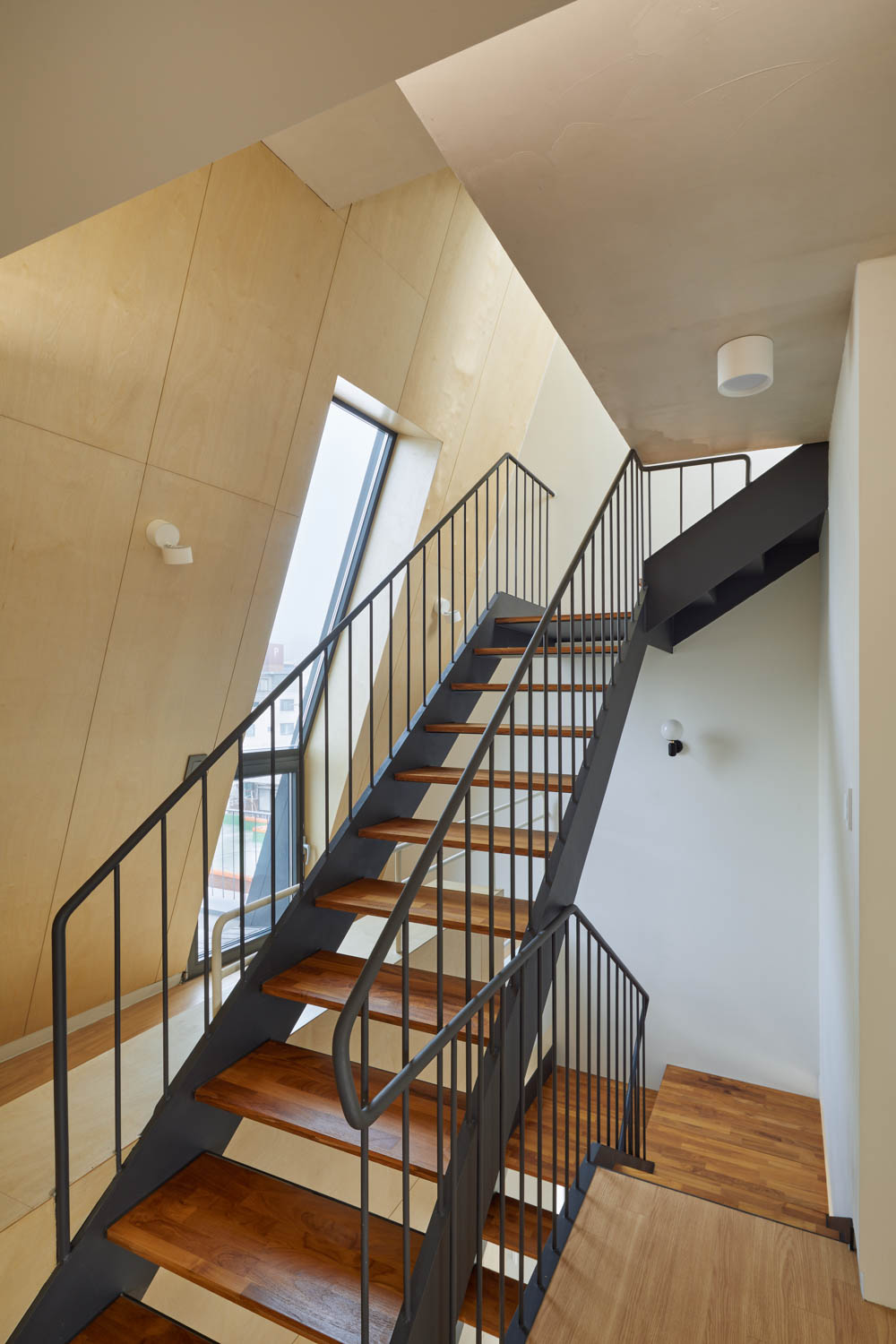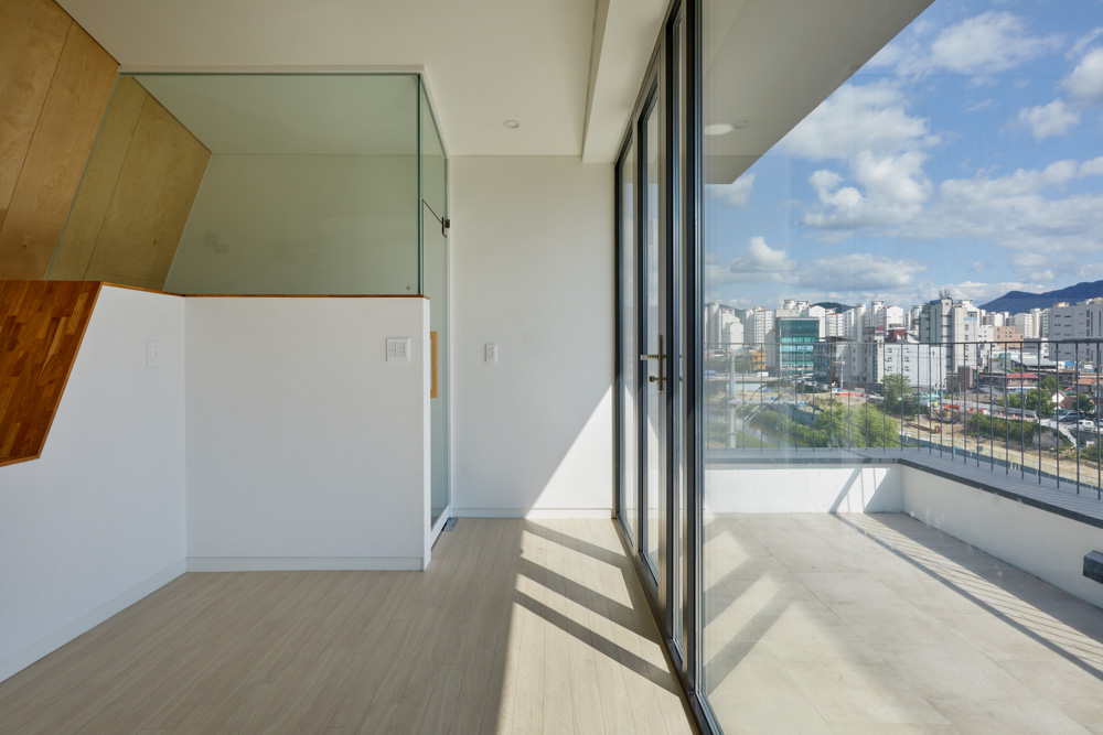1,2층 근린생활시설, 2∼5층 협소주택으로 구성되어 있다. 접근성과 전망이 좋아 상가로서는 적합하지만 주택으로서는 불리하다는 양면성이 있었다. 도로와 천변의 시선으로부터 주택을 보호하기 위해 상층부로 갈수록 개구부 틈을 좁히고 매스감을 살렸다. 최상층은 매스를 뒤로 Setback하여 보다 프라이빗한 공간을 만들었다. 그리고 규모의 한계상 같은 계단을 2층 상가와 주택이 사용해야 했다. 흡입력 있는 계단을 만들되 주택의 프라이버시를 위해 출입문을 숨기고, 계단의 시작은 보이지만 끝은 보이지 않도록 곡선으로 휘감아 계획했다.