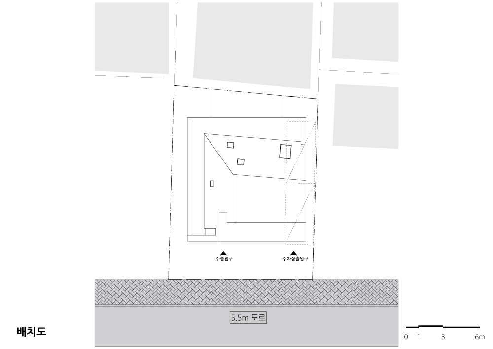 춘천의 구도심, 공지천 뚝방길에 인접한 이 작은 대지는 다양한 레벨, 속도 그리고 강한 수평선을 마주한다. 특히 수평선을 만나는 방법에 대해 고민을 많이 했는데 공지천을 따라 동서로 늘어선 볼륨들, 도로, 산책로 등 형태적인 수평선뿐 아니라 수평으로 끊임없이 흐르는 많은 움직임들이 있었다. 최대한 단순한 수평선과 수직선으로 Solid와 Void를 만들고 다양한 속도에 화답하는 리듬감을 주고자 했다.