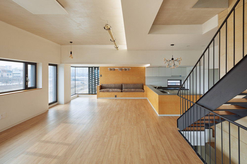 1,2층 근린생활시설, 2∼5층 협소주택으로 구성되어 있다. 접근성과 전망이 좋아 상가로서는 적합하지만 주택으로서는 불리하다는 양면성이 있었다. 도로와 천변의 시선으로부터 주택을 보호하기 위해 상층부로 갈수록 개구부 틈을 좁히고 매스감을 살렸다. 최상층은 매스를 뒤로 Setback하여 보다 프라이빗한 공간을 만들었다. 그리고 규모의 한계상 같은 계단을 2층 상가와 주택이 사용해야 했다. 흡입력 있는 계단을 만들되 주택의 프라이버시를 위해 출입문을 숨기고, 계단의 시작은 보이지만 끝은 보이지 않도록 곡선으로 휘감아 계획했다.