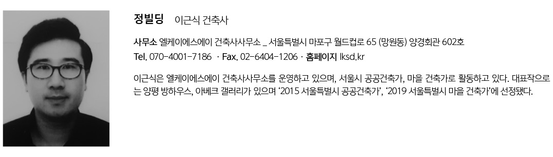 | 정빌딩 설계자 | 이근식 _ LKSA 건축사사무소 건축주 | 정명애 감리자 | 이근식 _ LKSA 건축사사무소 시공사 | 솔하임 건설 설계팀 | 조명선 대지위치 | 서울특별시 성동구 성수동1가 주요용도 | 근린생활시설 + 단독주택 대지면적 | 108.02㎡ 건축면적 | 64.40㎡ 연면적 | 177.57㎡ 건폐율 | 59.61% 용적률 | 164.38% 규모 | 지상 4층 구조 | 철근콘크리트조 외부마감재 | 노출콘크리트 내부마감재 | 석고, 노출콘크리트 설계기간 | 2018. 08 ~ 2019. 01 공사기간 | 2019. 03 ~ 2019.09 사진 | 구의진 전문기술협력 - 구조분야 : SDM - 기계설비분야 : 주신엠이씨 - 전기분야 : 엘림전설 |