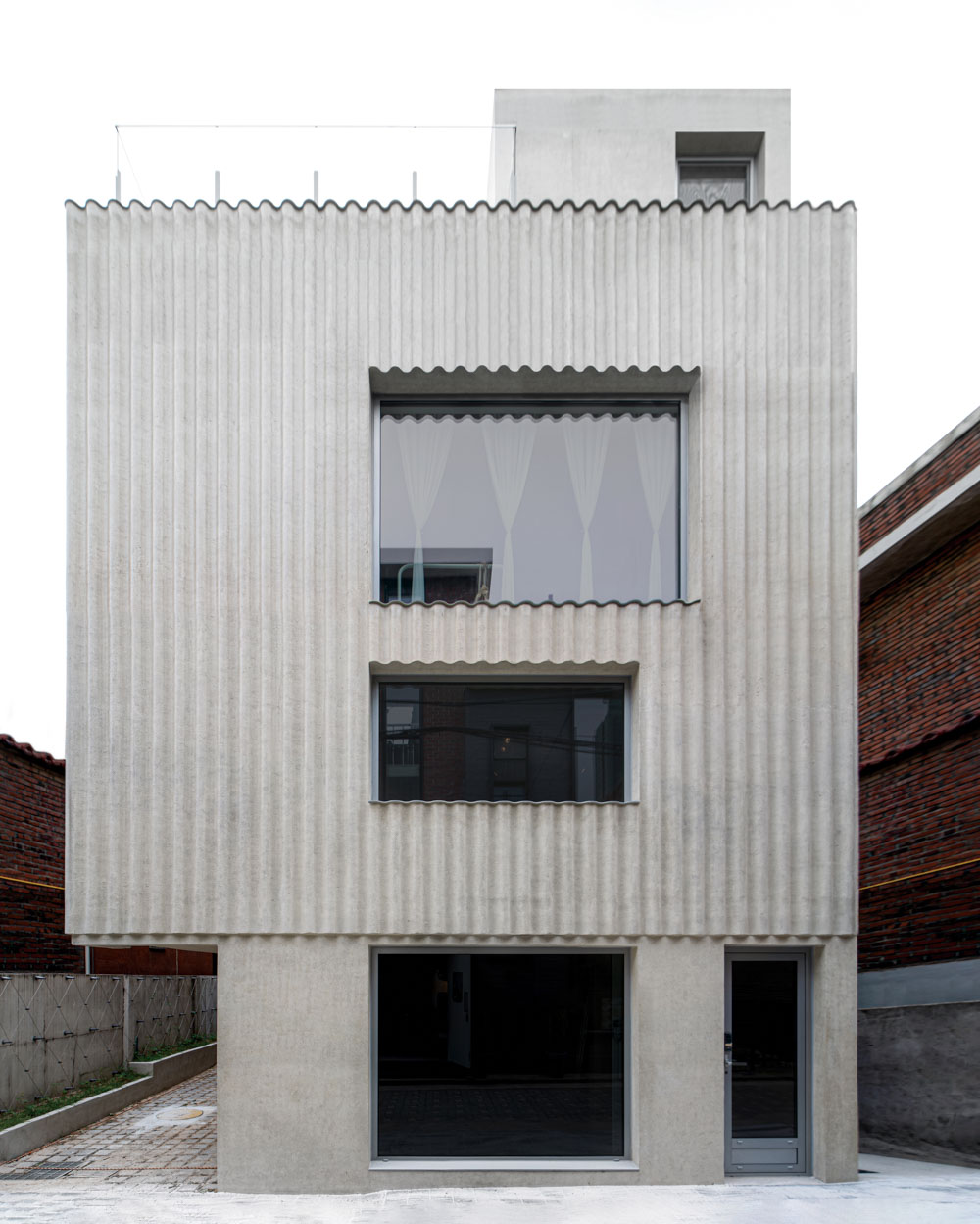 The building owner is a mother, who manages an art gallery and a boutique, and has a daughter who is a ballerina. She has captured every moment of her dancing daughter in the canvas and architectural space had to be a vessel that can accommodate their thoughts for the family who loved art and dance. The exposed concrete was designed as the embodiment of a wave-shaped acoustic sound to represent a trajectory of a beautiful life.