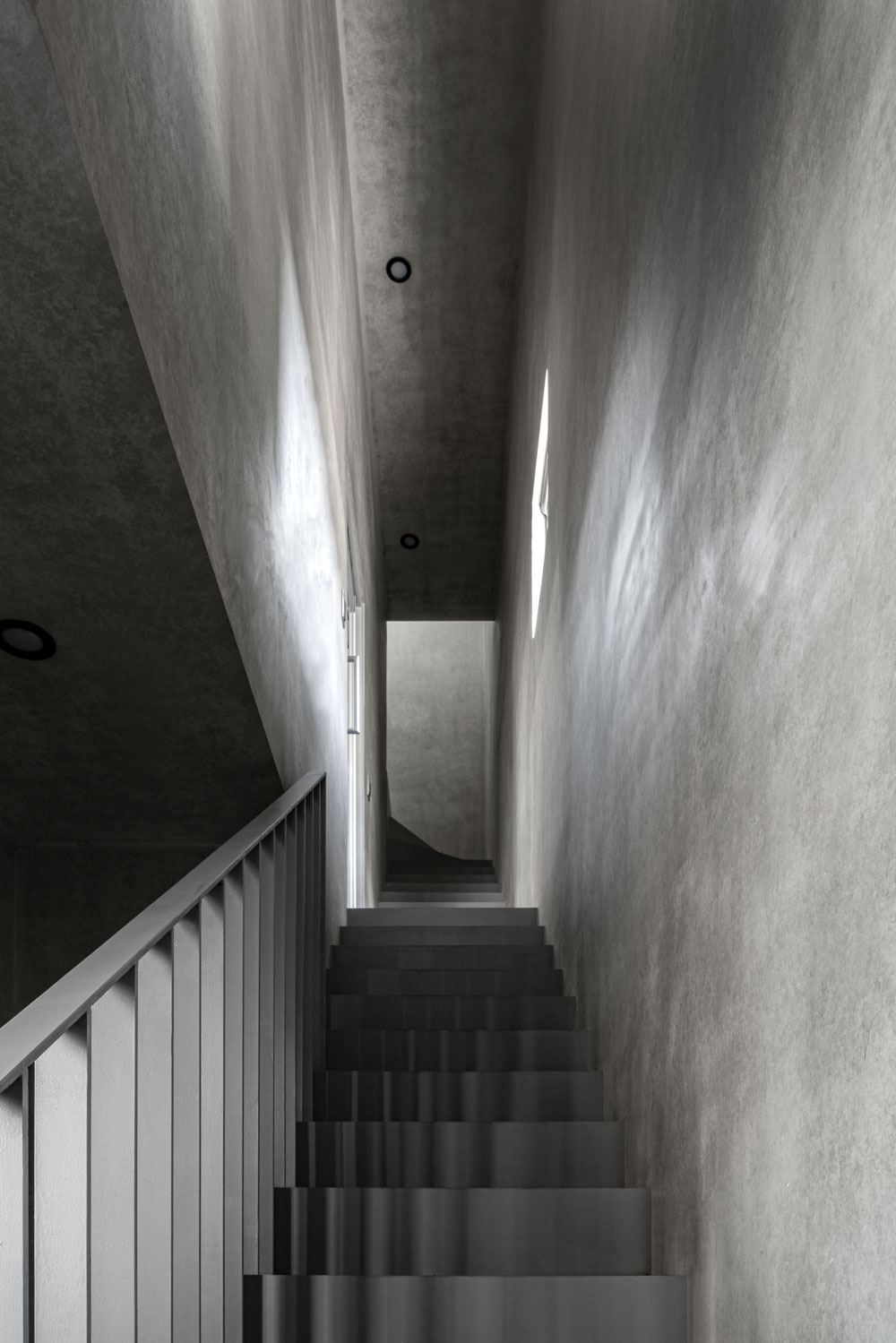 내부적으로는 동선을 최대한 단순화하며 작은 대지에서 건축이 차지할 공간의 효율성을 극대화하기 위해 디자인했다. 동선 상에서 곳곳에 빛의 통로를 만들어 어둠과 밝음을 교차시켜 노출콘크리트와 어우러져 그리는 빛의 리듬과 온화함을 내부에서도 느낄 수 있도록 의도했다.