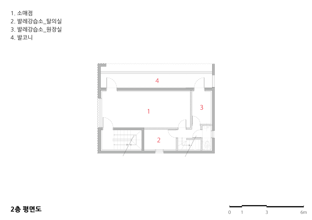 The building owner is a mother, who manages an art gallery and a boutique, and has a daughter who is a ballerina. She has captured every moment of her dancing daughter in the canvas and architectural space had to be a vessel that can accommodate their thoughts for the family who loved art and dance. The exposed concrete was designed as the embodiment of a wave-shaped acoustic sound to represent a trajectory of a beautiful life.