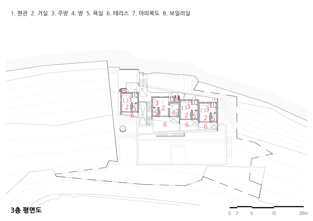 Zigzag form obtained from conditions of inclined terrain reflects a flow of force by land and is blended well with the scenery of the sea, thereby creating a variety of places to the entire surrounding land. The topographical condition with about 12m height results in a terrace on each story along with the separation of the program. The linearity of twisted natural terrain becomes a driving force to make a zigzag form by twisted mass in each story.