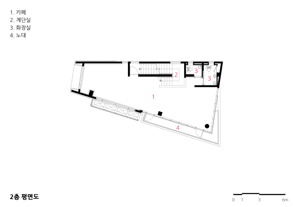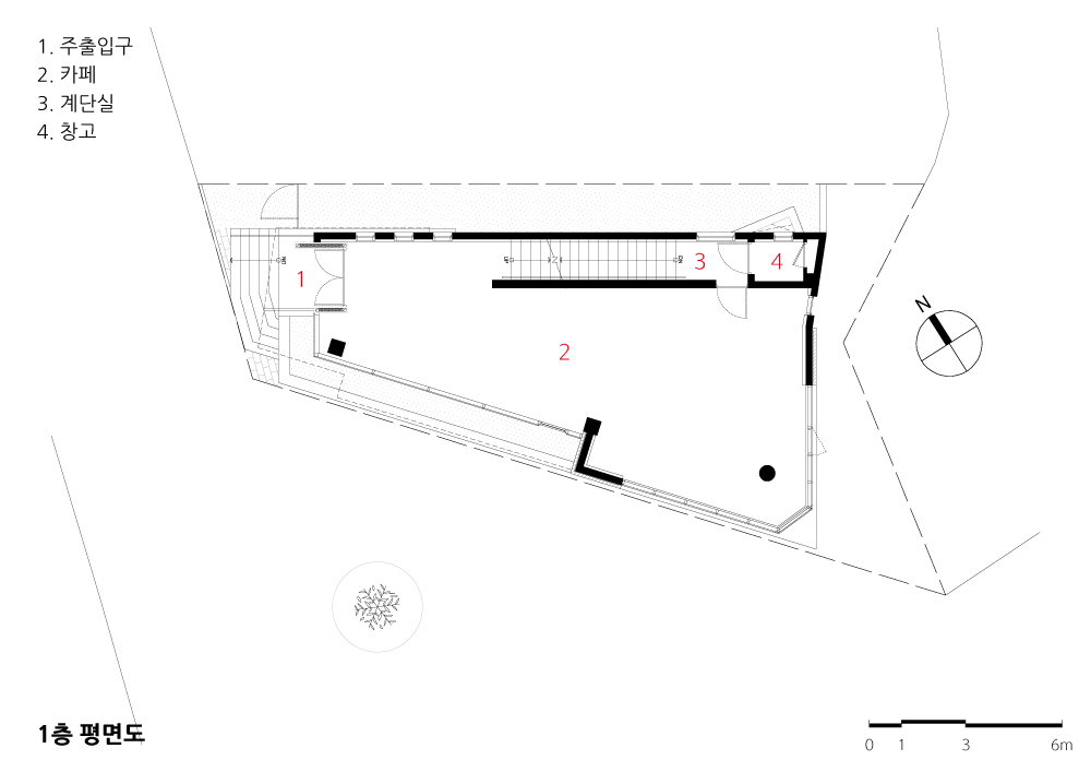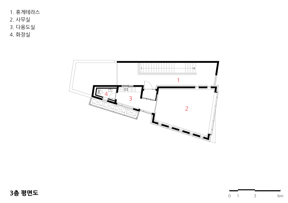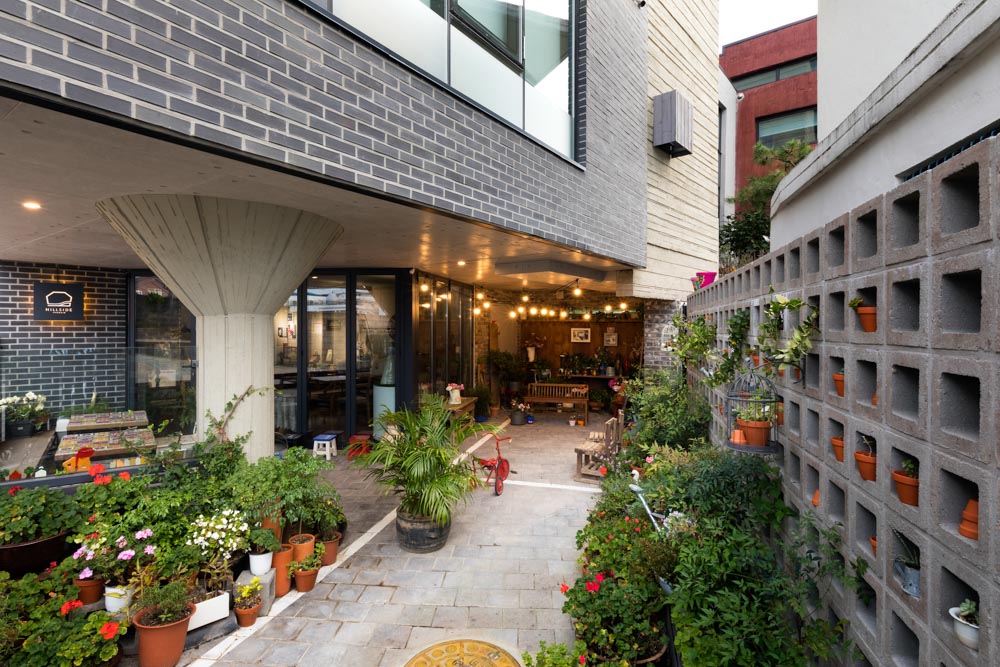 As main exterior materials, clay bricks were used for basement, first and second floors, whereas exposed concrete with wood board patterns and zinc were used for the third floor, taking into account the surrounding cultural assets and the context around it. The protruding narrow lumber(IPE) louver is a device for controlling interior and exterior landscapes by uniting the mass segmented surface, wide window, and material separation. It is expected to function as a filter of mass change and gaze flow.