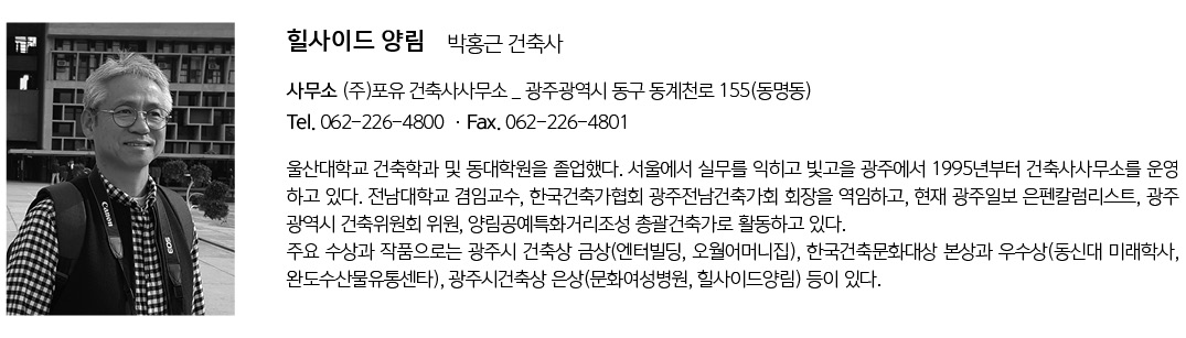| 힐사이드 양림 설계자 | 박홍근 _ (주)포유 건축사사무소 건축주 | 윤영돈 감리자 | 박홍근 _ (주)포유 건축사사무소 시공사 | (주)한가람건설 설계팀 | 이동근, 양정주 대지위치 | 광주광역시 남구 우월순길 12 주요용도 | 근린생활시설 대지면적 | 185.00㎡ 건축면적 | 108.26㎡ 연면적 | 328.65㎡ 건폐율 | 58.52% 용적률 | 130.63% 규모 | 지하 1층, 지상 3층 구조 | 철근콘크리트조 외부마감재 | 전벽돌, 노출콘크리트, 이페목, 징크 내부마감재 | 콘크리트 견출 마감 설계기간 | 2018. 01 ~ 2018. 07 공사기간 | 2018. 09 ~ 2019. 04 사진 | 조명환 전문기술협력 구조분야 : 국제구조 기계설비분야 : 새터이엔지 전기분야 : 거성엔지니어링 소방분야 : 거성엔지니어링 |