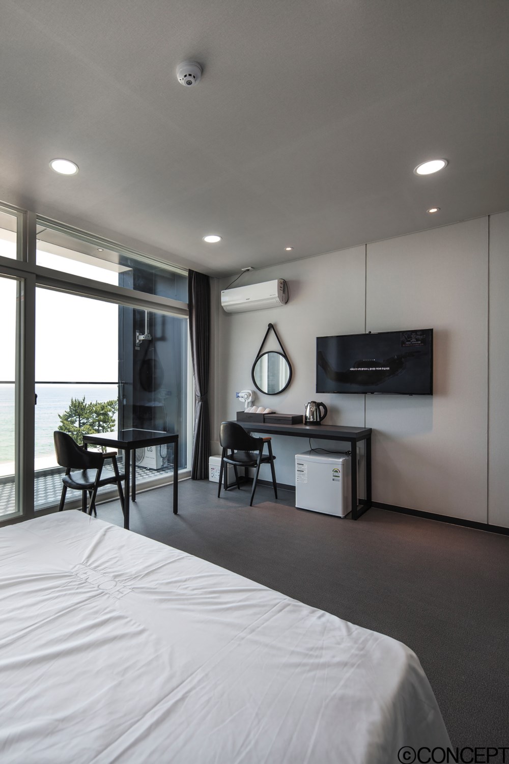 Cube Hotel is a newly created building through renovations. The front of the ground commands a superb view of nature, with the coast of Gyeongpo facing the lake and facing the lake behind. For the establishment of the Cube Hotel, a room to the right of the central core of the existing accommodation was opened throughout the entire floor and turned into a courtyard. The courtyard will provide a path for light and wind to interact with the outside. The extra floor area of the courtyard enabled the builders to make the required balcony for the Gyeongpo beach. And the simple and dynamic look was finally accomplished with a cube - shaped foot connie and black versus white collar contrast. In particular, the scenery of Gyeongpo Lake or Beach from the observation deck and the lounge area built on the ground floor of the Okseop give a gentle impression.