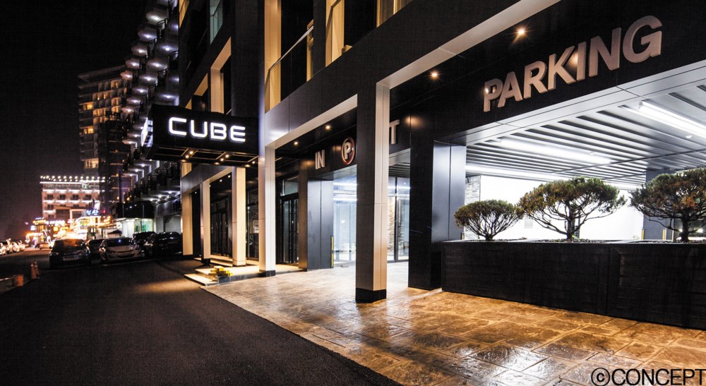 큐브호텔은 리노베이션을 통해 새롭게 탄생한 건물이다. 건물전면은 푸른 경포해변을 바라보고 있고 뒤로는 가까이 경포호수를, 멀리는 대관령을 마주보고 있는 뛰어난 자연경관을 지니고 있다. 큐브호텔의 탄생을 위해 먼저 기존 숙박시설의 중앙코어 우측에 있던 객실을 수직축으로 전 층을 오픈시켜 중정으로 탈바꿈시켰다. 이렇게 확보한 중정은 중복도에 외부와 소통할 수 있는 빛과 바람의 통로를 제공하게 된다. 중정을 만드는 과정에서 자연스럽게 생긴 여유 건축면적은 건축주가 요구한 경포해변 방향으로 향한 발코니를 건물전면에 확보할 수 있게 했다. 이러한 일련의 과정을 통해 직사각형의 비례체계를 적용한 큐브형태의 발코니는 블랙과 화이트칼라의 대비감을 통해 간결하고도 역동적인 외관으로 변신하게 됐다. 특히 옥탑 층에 조성된 휴게공간과 전망대에서 바라보이는 경포호수와 해변의 풍경은 잔잔한 여운을 주고 있다.