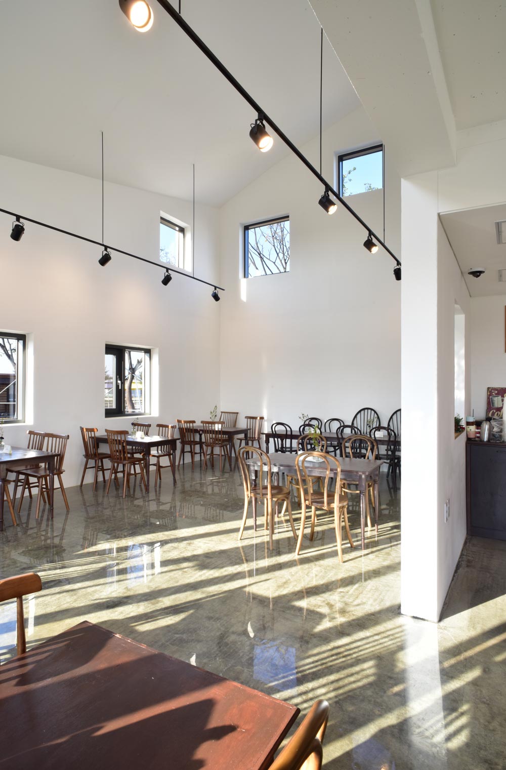 밝고 부드러운 빛은 카페의 고창과 전면 창으로 깊숙이 들어오고, 건물 후면 유치원의 수목들과 푸른 하늘이 창에 비친다.