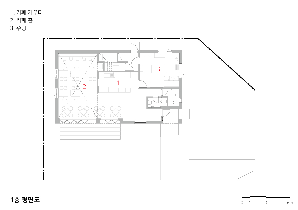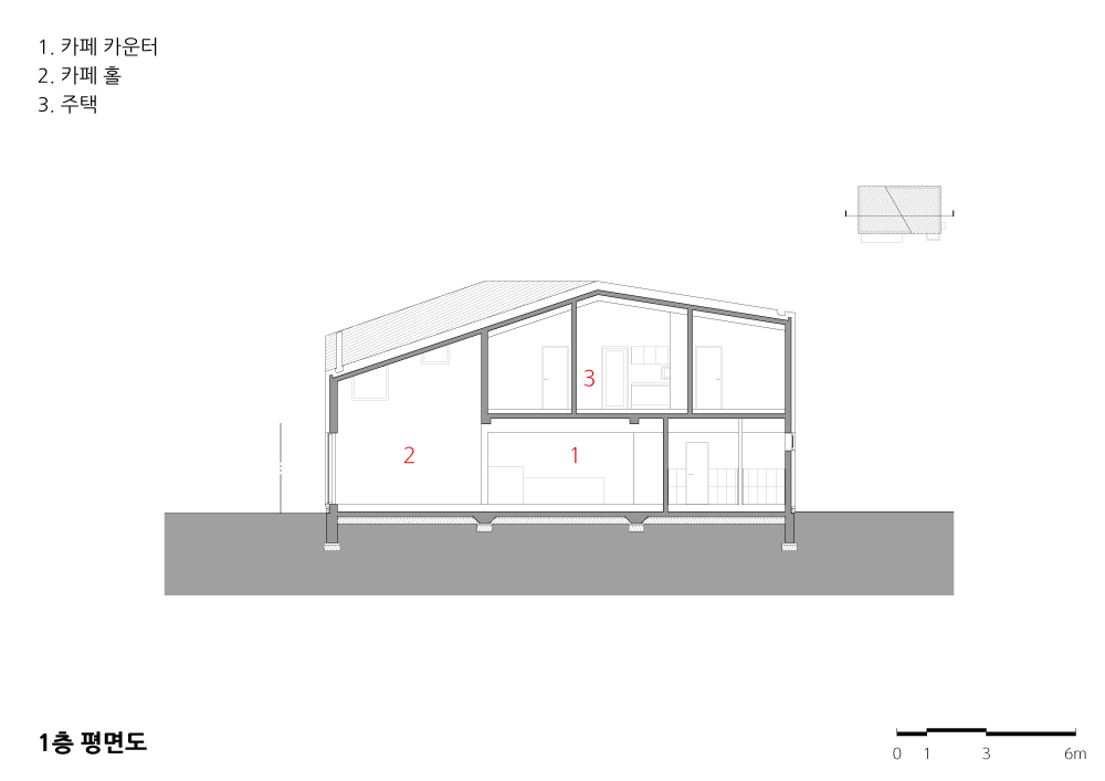 1층 카페는 넓은 공간은 아니지만 건물 전면의 너른 외부공간과 2층 높이의 경사 천정 때문에 시각적, 공간적 여유로움이 생겼다.