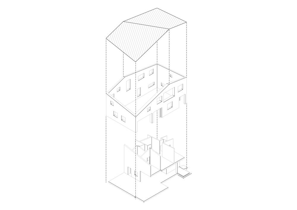 The architectural floor plan is rectangular, but the ridge of a roof is turned diagonally from the center of the building, and the two slopes of left and right roofs are applied differently. The various heights and slopes of the eaves on the four sides of the building are the abstract representation of nature's irregularities.