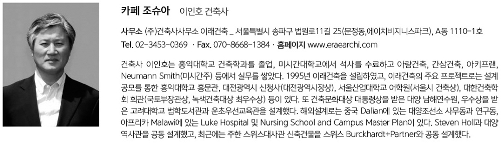| 카페 조슈아 설계자 | 이인호 _ (주)건축사사무소 이래건축 건축주 | 이상준, 김현정 감리자 | 이인호 _ (주)건축사사무소 이래건축 시공사 | (주)윤명종합건설 설계팀 | 이은미 / 권혜지 대지위치 | 경기도 평택시 화촌2길 7-15 주요용도 | 제1종 근린생활시설, 단독주택 대지면적 | 707.00㎡ 건축면적 | 132.16㎡ 연면적 | 199.13㎡ 건폐율 | 18.69% 용적률 | 28.17% 규모 | 지상 2층 구조 | 철근콘크리트조 외부마감재 | 건물 외벽 : 엠보싱 텍스처 마감 위 실리콘수지도장 창호 : THK24 로이복층유리, THK38 로이삼중유리 지붕 : THK0.7 아연도 강판 내부마감재 | 벽 : 석고보드 위 친환경페인트, 석고보드 2겹 위 실크벽지 천장 : 콘크리트 면처리 후 친환경수성페인트, 석고보드 2겹 위 실크벽지 바닥 : 에폭시 라이닝, 온돌마루 설계기간 | 2018. 11 ~ 2019. 02 공사기간 | 2019. 04 ~ 2019. 10 사진 | 이인호 전문기술협력 구조분야 : SQ엔지니어링(주) 기계설비분야 : (주)노스타엔지니어링 전기·통신분야 : (주)전기설계·협인 |