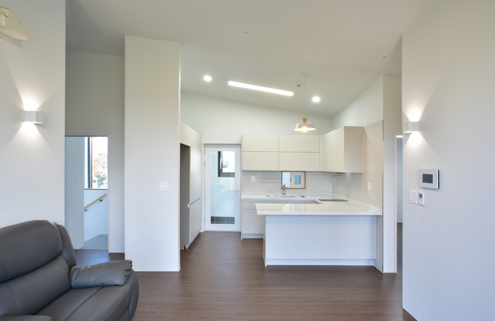 2층 거주공간으로 오르면 대형 수직 창을 통해서 유치원 전경이 보이고, 지붕의 형상에 따른 경사진 천장들에 의해서 각 실들은 서로 다른 공간적인 형태를 갖게 됐다.