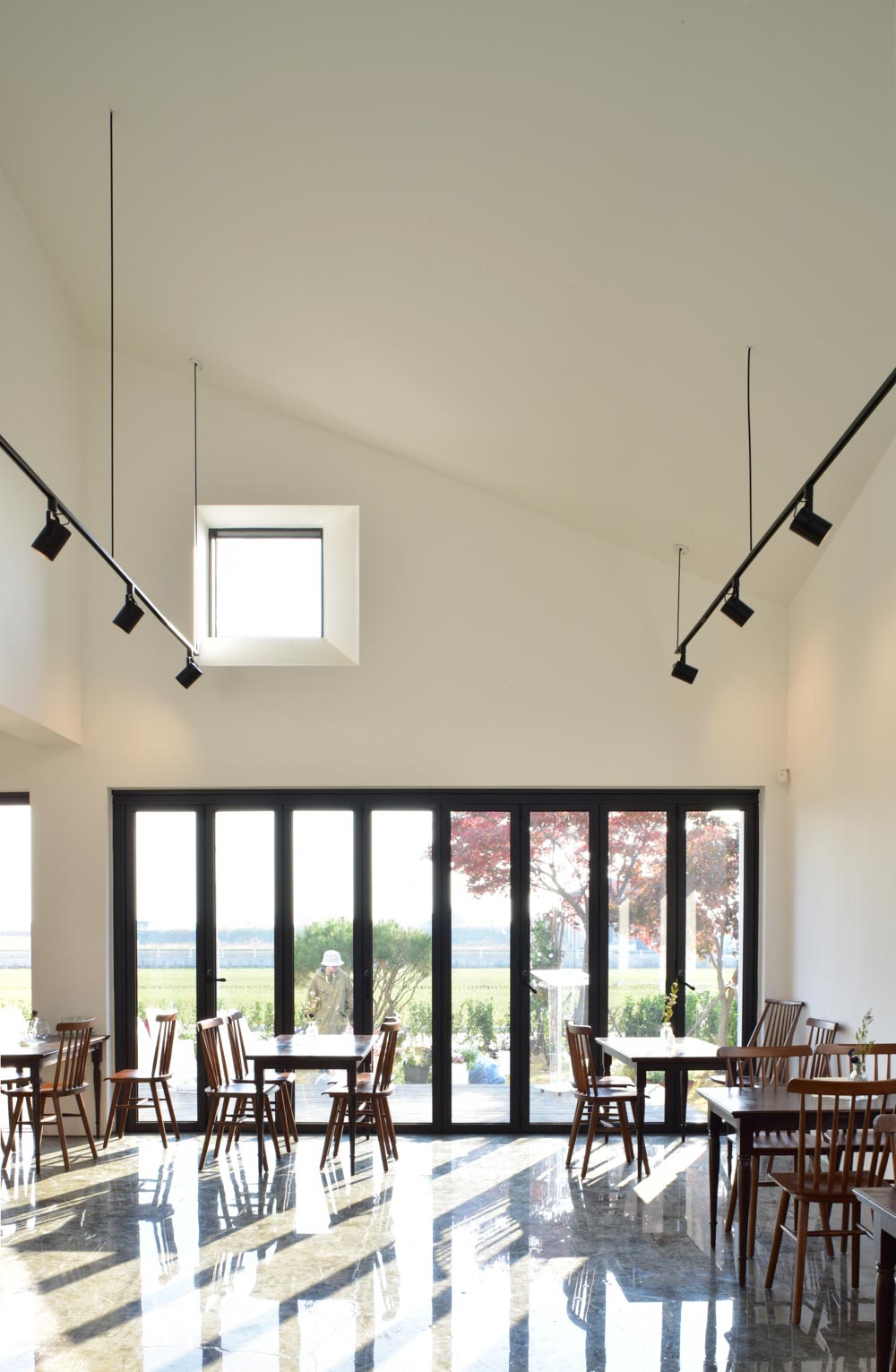 밝고 부드러운 빛은 카페의 고창과 전면 창으로 깊숙이 들어오고, 건물 후면 유치원의 수목들과 푸른 하늘이 창에 비친다.