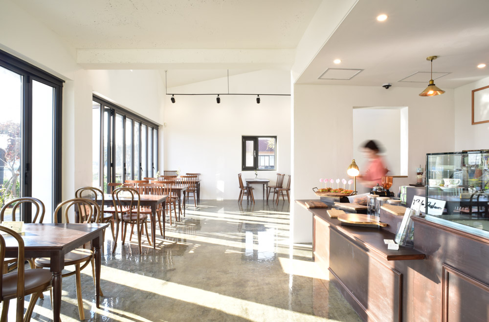Cafe Joshua glows soft blue early in the early morning and changes to apricot along with the plain that embraces Anseong River at sunset.