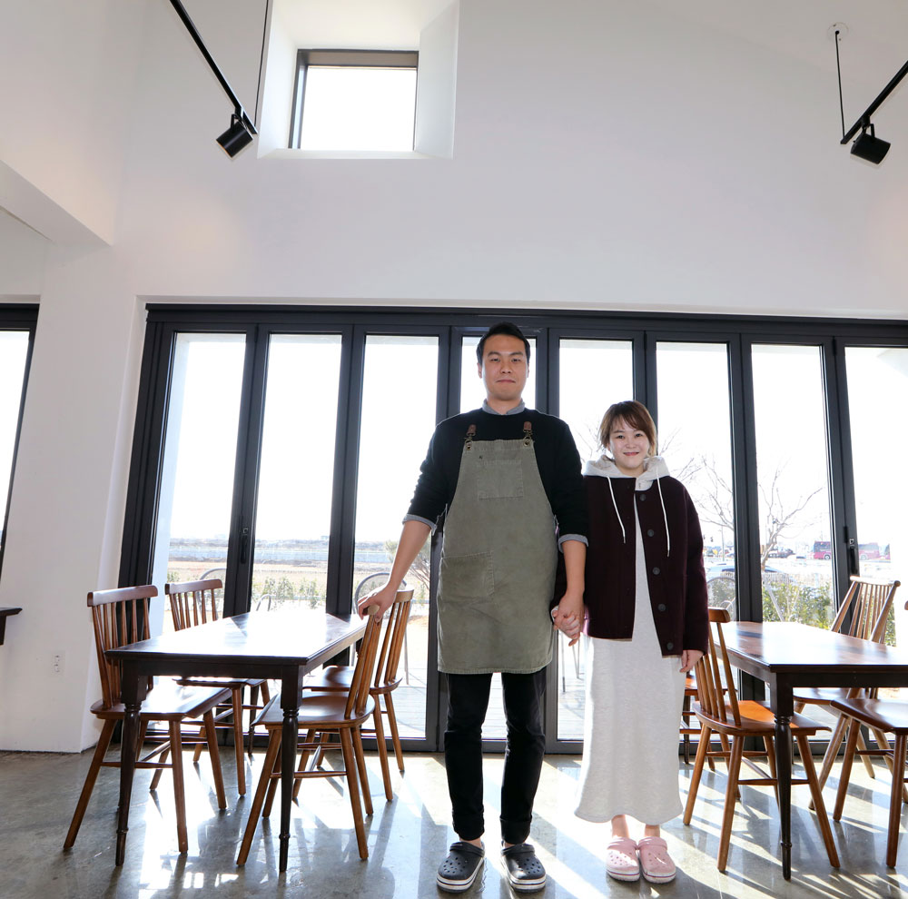 처음에 부부는 건축사의 이 ‘특별한 기획’에 고개를 갸웃거렸다. 황량한 주변에 비해 튀지 않을까 우려됐기 때문이다. 하지만 하얀 설계 모형물을 본 후부터 부부는 건축사를 전적으로 신뢰하게 됐다. 건축사는 회벽을 바른 옛 초가집을 생각해서 콘셉트 색상을 화이트로 정했다. 의도대로 하얀 엠보싱 텍스처로 마감한 외관은 햇빛이 드는 위치에 따라 다양하면서 자연스러운 분위기를 연출하는 한편 주변과도 조화를 이룬다. 여러 부분으로 꺾인 지붕과 이층까지 뚫려있는 높은 천장은 카페를 보다 입체적이고 열린 공간으로 만들었다.