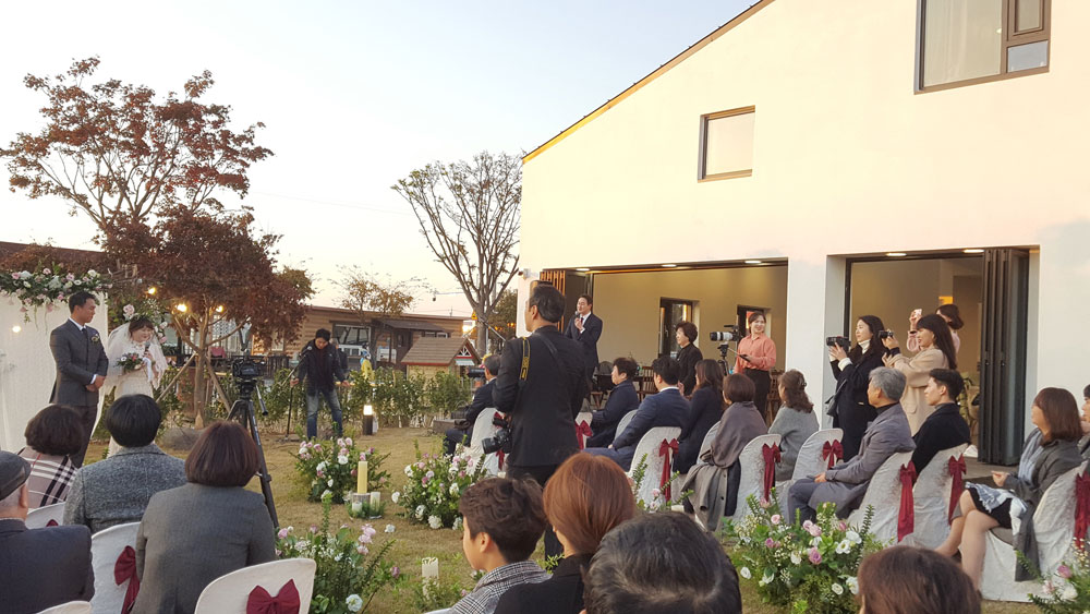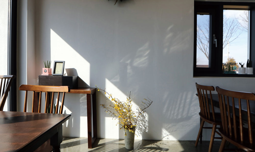 처음에 부부는 건축사의 이 ‘특별한 기획’에 고개를 갸웃거렸다. 황량한 주변에 비해 튀지 않을까 우려됐기 때문이다. 하지만 하얀 설계 모형물을 본 후부터 부부는 건축사를 전적으로 신뢰하게 됐다. 건축사는 회벽을 바른 옛 초가집을 생각해서 콘셉트 색상을 화이트로 정했다. 의도대로 하얀 엠보싱 텍스처로 마감한 외관은 햇빛이 드는 위치에 따라 다양하면서 자연스러운 분위기를 연출하는 한편 주변과도 조화를 이룬다. 여러 부분으로 꺾인 지붕과 이층까지 뚫려있는 높은 천장은 카페를 보다 입체적이고 열린 공간으로 만들었다.