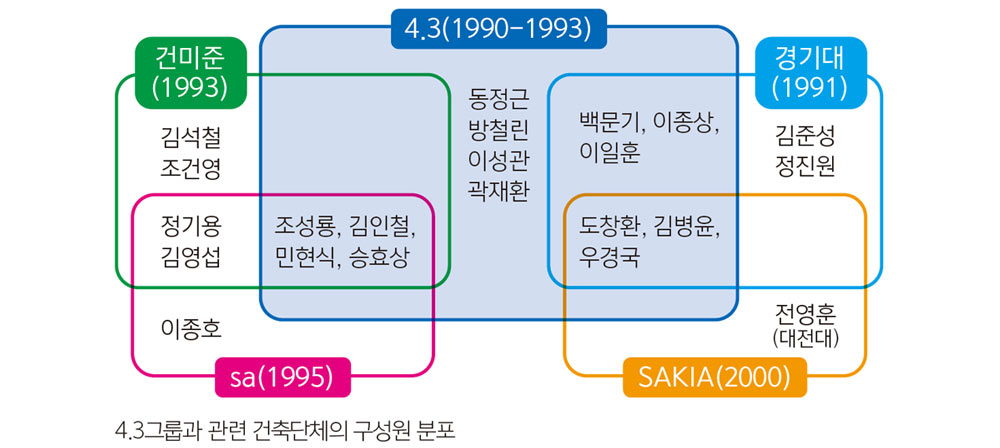 4.3.그룹은 이 힘의 공백, 혹은 권력과 권위가 불일치된 틈새에 자리하였다. 아니 4.3그룹만 있었던 것은 아니다. 사회 참여에 좀 더 관심이 있었던 사람들은 ‘건미준(건축의 미래를 준비하는 모임)’을 결성하였고, 이는 후에 민예총(뒤에는 민건협) 그리고 더 멀리는 새건협으로 이어진다. 제도권 안에서도 경기대학에서 튜터 시스템에 근거한 새로운 건축설계교육에 대한 실험이 있었고, 이 경험은 sa(서울건축학교)로 이어진다. 현업의 건축사들이 참여하는 새로운 형식의 설계 교육에 대한 갈망은 커서, 이러한 설계워크숍은 대전과 대구, 광주전남 등 지역 단위의 학교와 대한건축사협회 시도건축사회가 공동으로 주최하는 건축캠프, 한국건축가협회에서 주관하는 대안학교인 SAKIA와 민건협의 여름건축캠프 등 다양한 형식으로 퍼져나갔다.