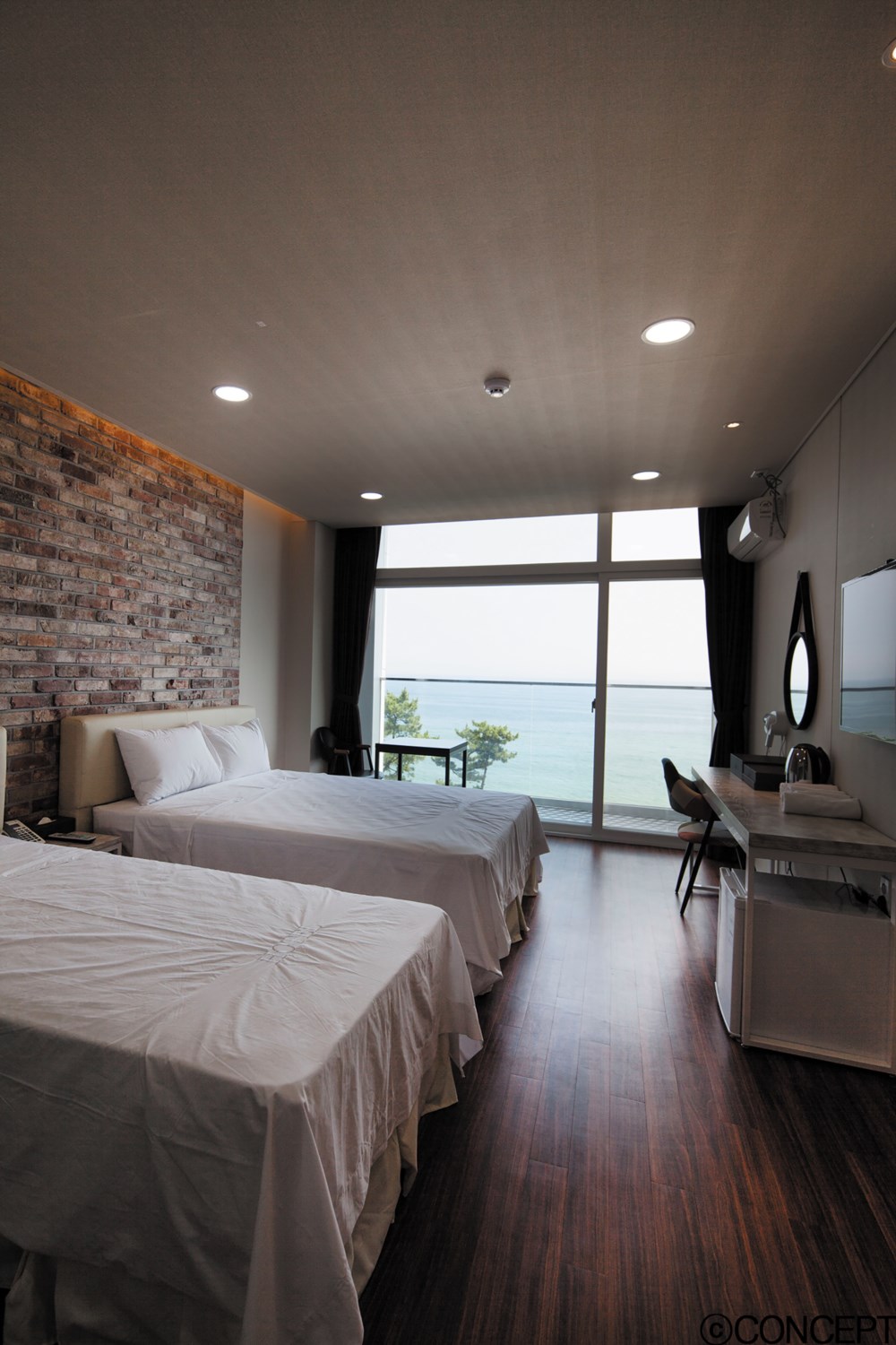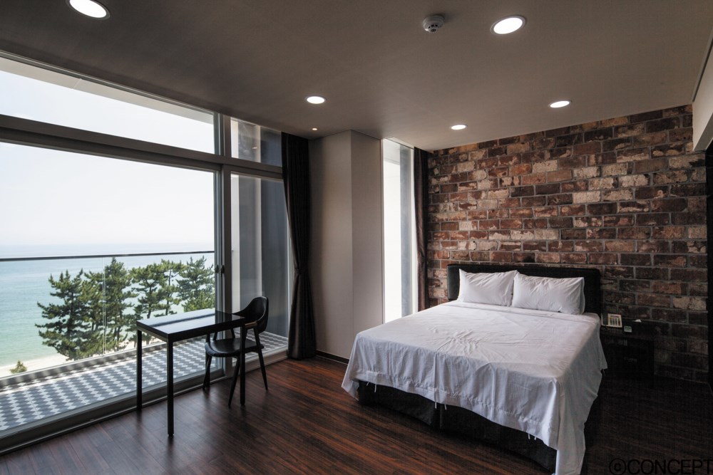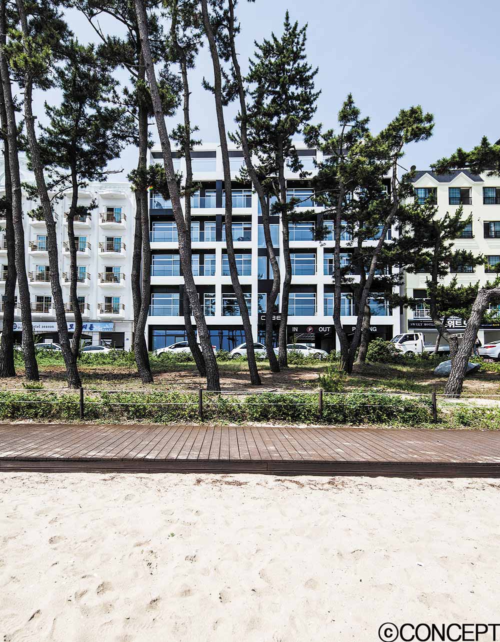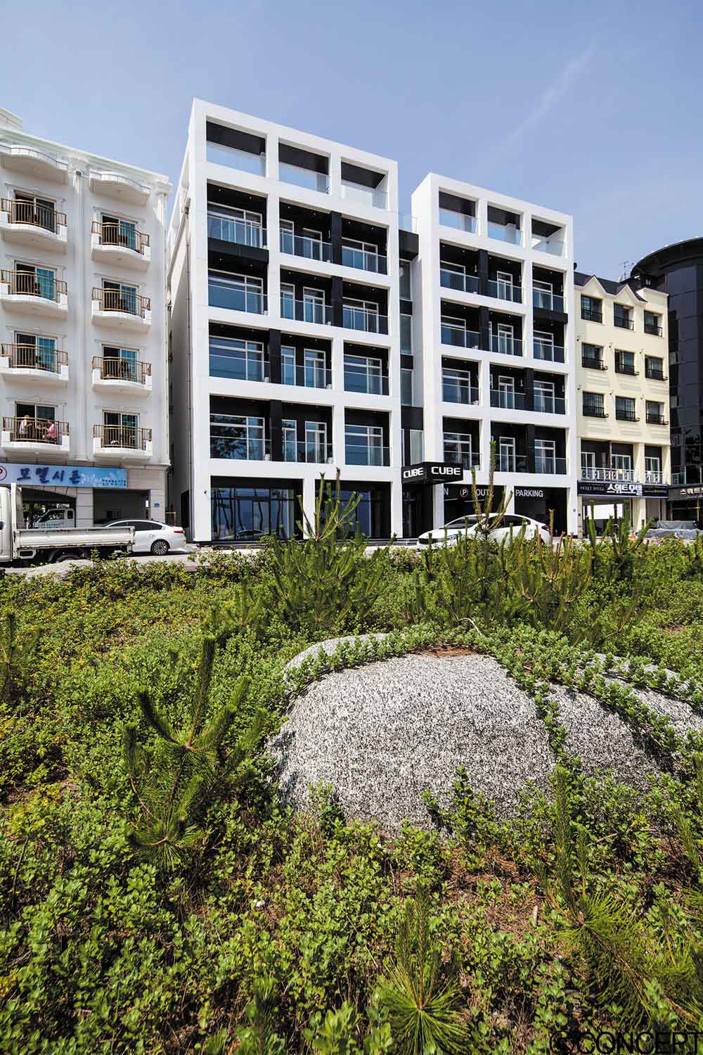 Cube Hotel is a newly created building through renovations. The front of the ground commands a superb view of nature, with the coast of Gyeongpo facing the lake and facing the lake behind. For the establishment of the Cube Hotel, a room to the right of the central core of the existing accommodation was opened throughout the entire floor and turned into a courtyard. The courtyard will provide a path for light and wind to interact with the outside. The extra floor area of the courtyard enabled the builders to make the required balcony for the Gyeongpo beach. And the simple and dynamic look was finally accomplished with a cube - shaped foot connie and black versus white collar contrast. In particular, the scenery of Gyeongpo Lake or Beach from the observation deck and the lounge area built on the ground floor of the Okseop give a gentle impression.