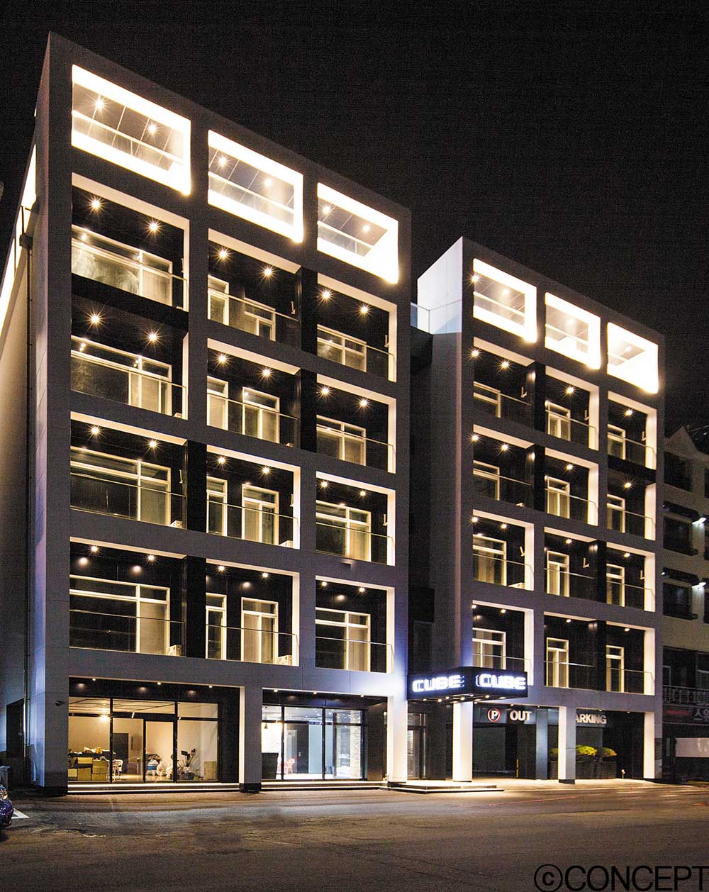 큐브호텔은 리노베이션을 통해 새롭게 탄생한 건물이다. 건물전면은 푸른 경포해변을 바라보고 있고 뒤로는 가까이 경포호수를, 멀리는 대관령을 마주보고 있는 뛰어난 자연경관을 지니고 있다. 큐브호텔의 탄생을 위해 먼저 기존 숙박시설의 중앙코어 우측에 있던 객실을 수직축으로 전 층을 오픈시켜 중정으로 탈바꿈시켰다. 이렇게 확보한 중정은 중복도에 외부와 소통할 수 있는 빛과 바람의 통로를 제공하게 된다. 중정을 만드는 과정에서 자연스럽게 생긴 여유 건축면적은 건축주가 요구한 경포해변 방향으로 향한 발코니를 건물전면에 확보할 수 있게 했다. 이러한 일련의 과정을 통해 직사각형의 비례체계를 적용한 큐브형태의 발코니는 블랙과 화이트칼라의 대비감을 통해 간결하고도 역동적인 외관으로 변신하게 됐다. 특히 옥탑 층에 조성된 휴게공간과 전망대에서 바라보이는 경포호수와 해변의 풍경은 잔잔한 여운을 주고 있다.