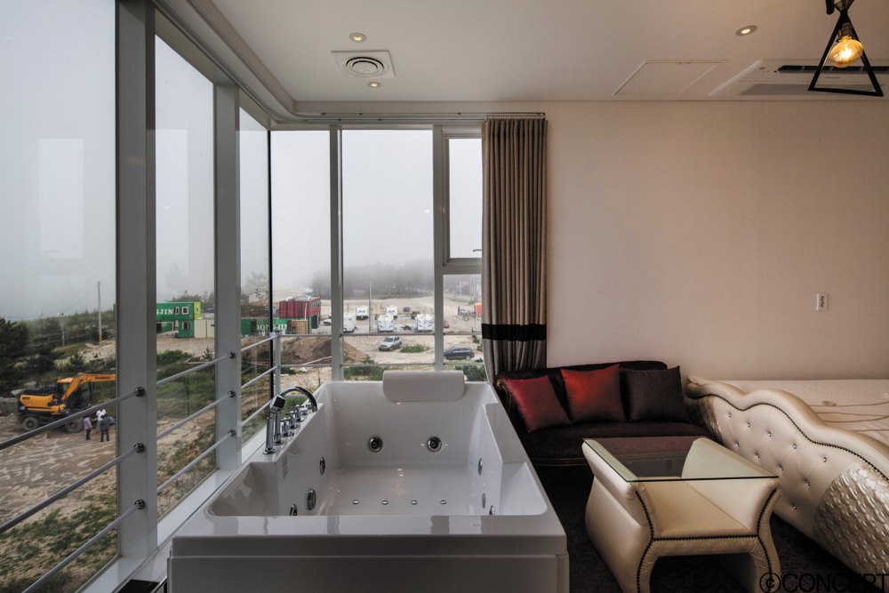 2018 동계올림픽 빙상경기 개최도시 강릉은 새로운 도전에 직면해 있다. 설계를 시작하면서 올림픽 이후 지속적 관광수요 창출과 동해안 연안의 친환경 개발(연안으로부터 500미터) 및 보존의 두 과제와 마주했다. 본 프로젝트는 황무지 모래밭에 우후죽순 컨테이너 건물로 뒤덮이는 컨텍스트의 중심에 있는 건물이다. 난개발이 아닌 친연안형 건축물을 위해 단순한 매스와 입면으로서 파사드 디자인 요소를 최대한 자제하는 노력의 산물로 탄생됐다. 인테리어 재료의 물성과 설비도 같은 원칙에 따라 미니멀 디자인을 추구했다.
