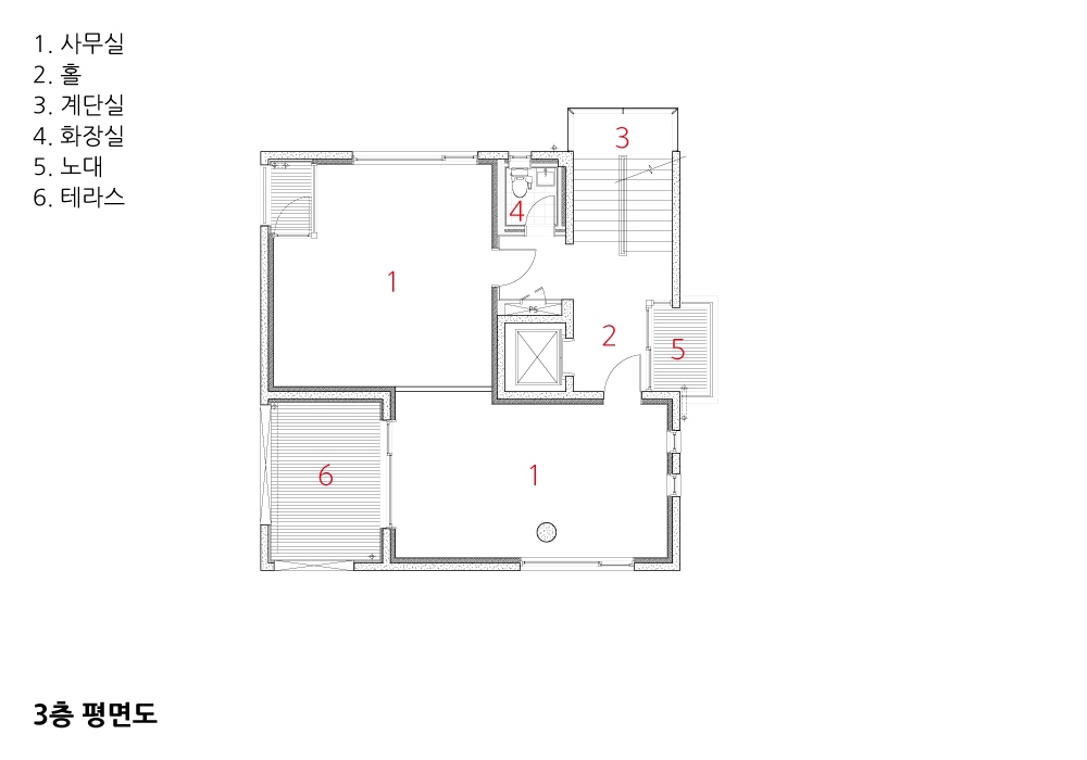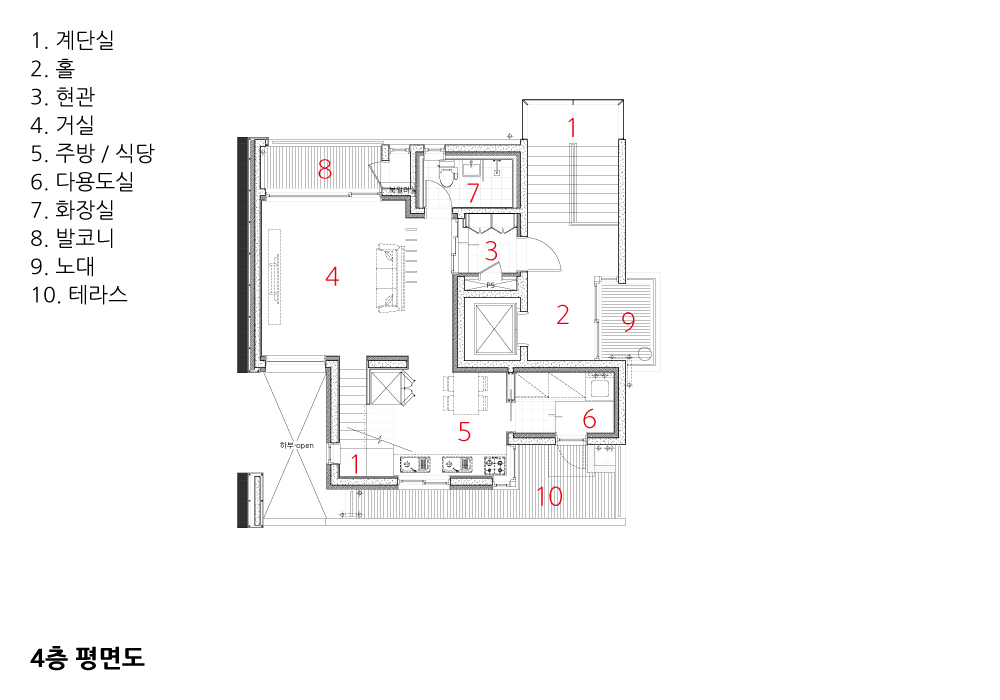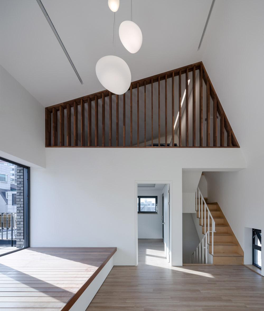 주상복합 프로그램이 혼합된 건물의 경우, 상업성과 거주성이 공존하는 좋은 단일 건축으로 만드는 것이 중요하다. 도시주거에서 거주성이란 무엇일까? 우리는 여기서 내·외부 공간이 서로 관계를 만드는 테라스가 있는 주거를 생각했다. 테라스는 내부실과 적극적으로 관계 맺으면서 복층의 구조를 갖추고 있다. 4층은 부엌과 연계된 실용적인 테라스로, 5층에는 가족실과 안방과 바로 이어지는 마당을 만들었다. 특히 가족실과 이어지는 마당은 내부 대청이 그대로 외부 툇마루로 이어져 내·외부를 더욱 긴밀한 관계로 만들어준다.