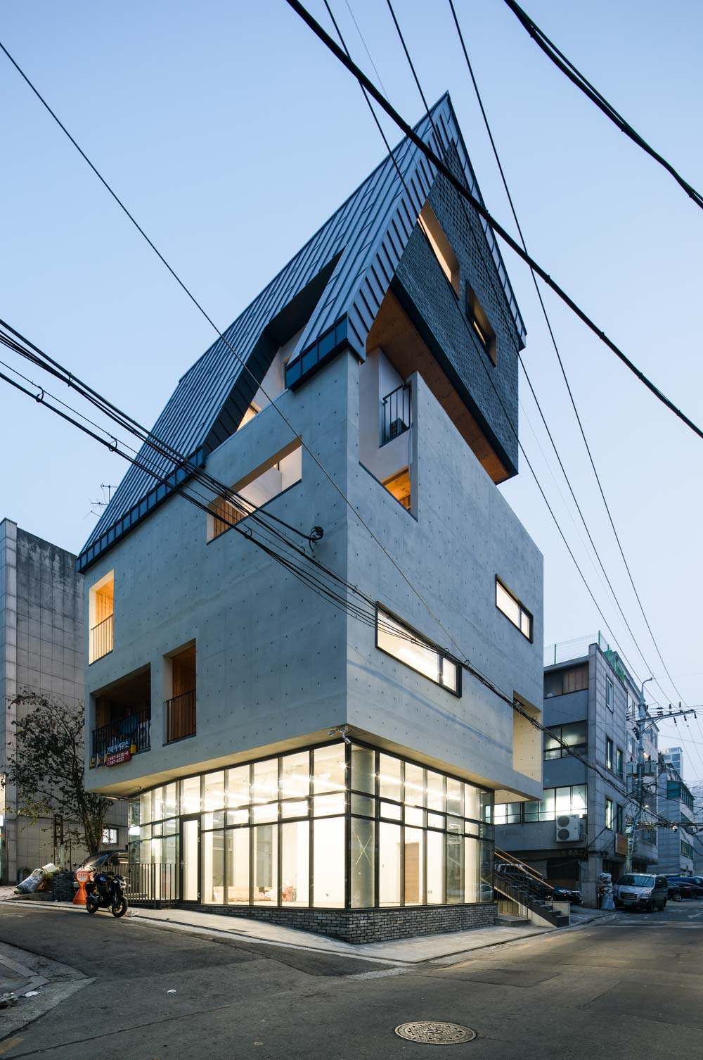 Corner building Architect | Hong, Mansik _ RICHUE Architect Client | Jung, Sorim / Kim, Minhee Supervisor | Hong, Mansik _ RICHUE Architect Construction | Iewoo Project team | Lim, Doyoung Location | 37, Dasan-ro 42da-gil, Jung-gu, Seoul, Korea Program | Neighborhood facility Site area | 210.00㎡ Building area | 119.66㎡ Gross floor area | 545.55㎡ Building to land ratio | 56.98% Floor area ratio | 199.67% Building scope | B1F - 5F Structure | RC Exterior finishing | Exposed concrete, Zinc Interior finishing | Paint, Wallpaper Design period | Sep. 2015 ~ Aug. 2016 Construction period | Aug. 2016 ~ Nov. 2017 Photograph | Kim, Yongsoon Structural engineer | Kwang rim stuructural engineering office Mechanical engineer | Codam Co. Ltd. Electrical engineer | Codam Co. Ltd. Fire engineer | Codam Co. Ltd. |