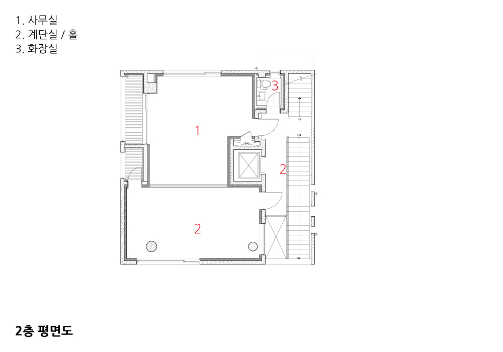 The stairways and hallways leading to each room allow you to naturally meet the scenery and people of the city just as you come across people when you walk around the city. The staircase is not just a movement flow, but a path connecting city streets, which function in various ways.