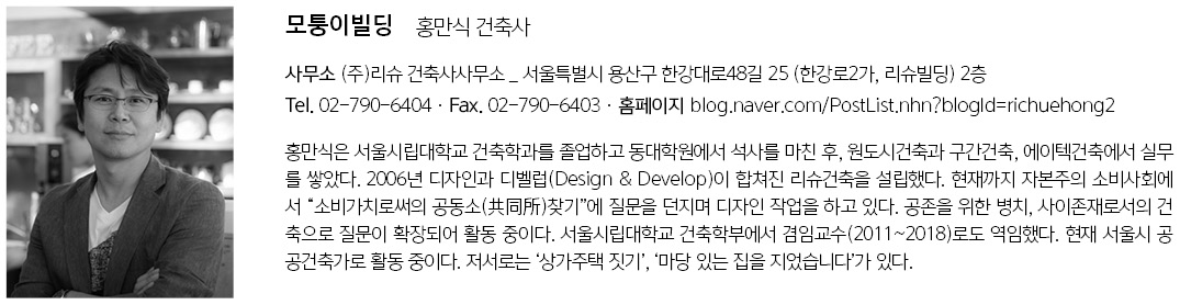 | 모퉁이빌딩 설계자 | 홍만식 _ (주)리슈 건축사사무소 건축주 | 정소림, 김민희 감리자 | 홍만식 _ (주)리슈 건축사사무소 시공사 | 바른건축 이우 설계팀 | 임도영 대지위치 | 서울특별시 중구 다산로42다길 37 주요용도 | 제2종 일반주거지역(12층 이하) 대지면적 | 210.00㎡ 건축면적 | 119.66㎡ 연면적 | 545.55㎡ 건폐율 | 56.98% 용적률 | 199.67% 규모 | 지하 1층, 지상 5층 구조 | 철근콘크리트조 외부마감재 | 노출 콘크리트, 리얼징크 내부마감재 | 석고보드 위 지정벽지, 노출 미장 설계기간 | 2015. 09 ~ 2016. 08 공사기간 | 2016. 08 ~ 2017. 11 사진 | 김재윤 전문기술협력 - 구조분야 : 광림구조 - 기계설비분야 : 코담기술단 - 전기분야 : 코담기술단 - 소방분야 : 코담기술단 |