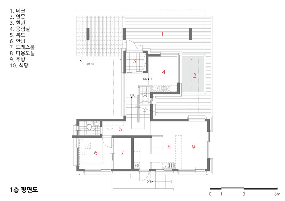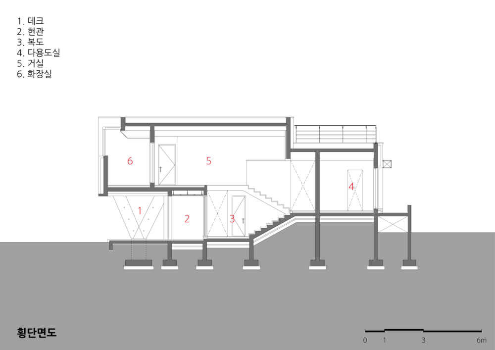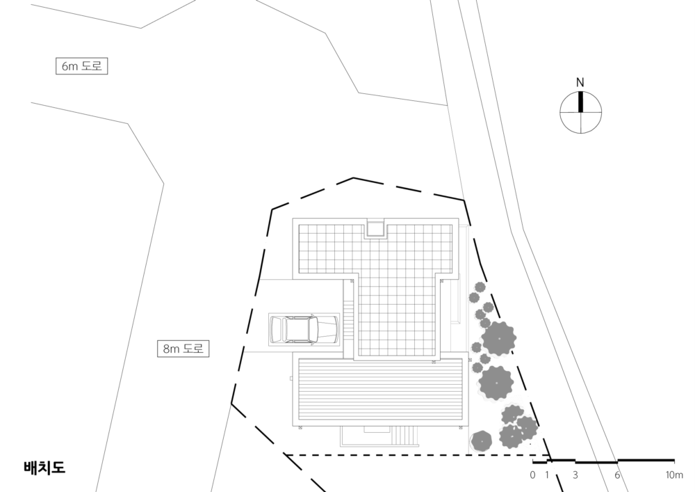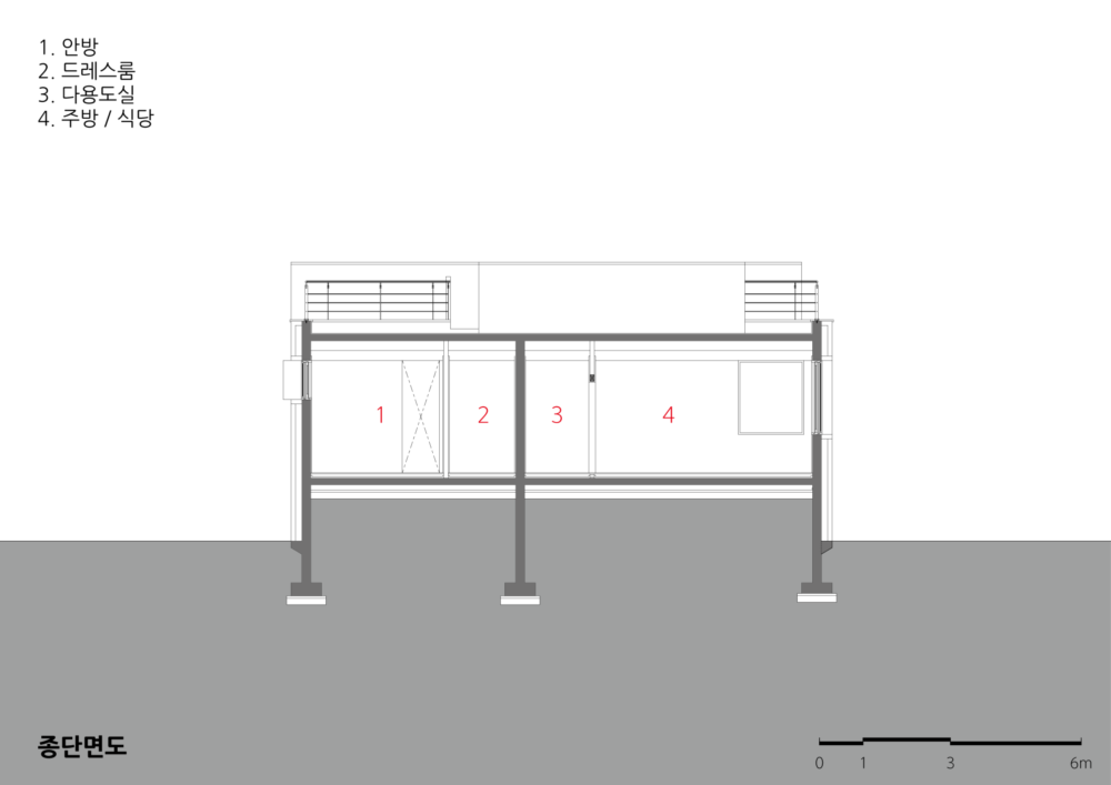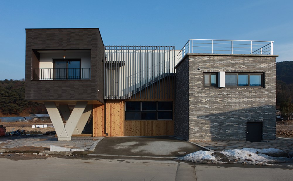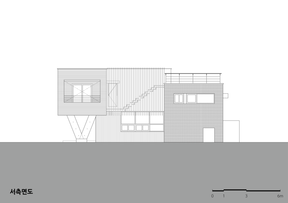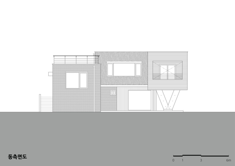 First, the main entrance and the upper part of a parking lot were designed to meet the two requirements by protruding the mass from the upper part upon the client's request to make it avoiding rain or snow, and to give tension by visualizing structural pillars in the protruding mass. Therefore, the natural space of nuha(樓下) serves as a main entrance, and plays a role of children's play space and community space with neighbors as well. Each room was arranged along low floors, and some shared spaces connecting each space were arranged to facilitate the gathering of the family.