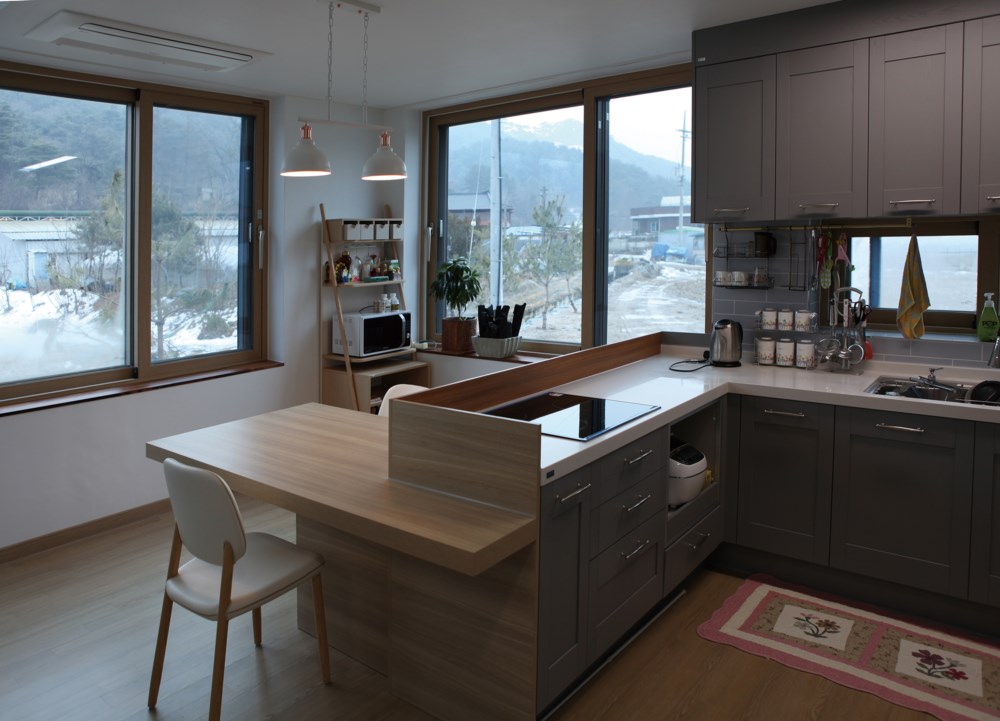현관을 들어서면 좌측에는 단차가 있는 응접실이 위치하는데 이는 마을분들이나 손님을 내부공간까지 들이지 않기 위함이고 복도보다 낮은 단차를 두어서 응접실 창을 통해 주변 송림을 조망할 수 있도록 했다. 반층을 올라오면 안방과 주방 및 식당이 위치하는데 이곳에서는 거실과 일부 오픈되어 있어서 주방과 거실에서 부모와 아이들이 서로를 관찰할 수 있도록 했다. 다시 반층을 올라오면 자녀방과 거실을 두었으며 화장실은 천창을 설치해서 쾌적한 공간이 되도록 했다.