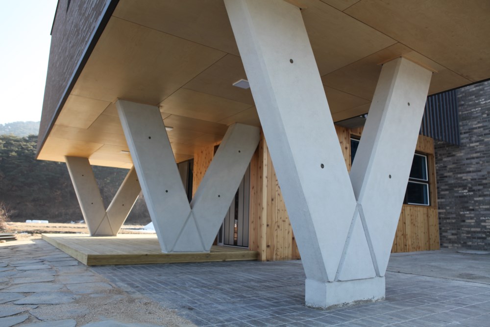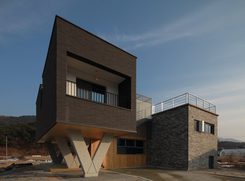 먼저 주출입구와 주차장 상부는 눈이나 비를 피할 수 있어야 한다는 건축주 요구사항에 따라 상부에서 매스를 돌출시켜서 두 가지를 충족시키고 돌출된 매스에 구조적인 기둥을 시각화해서 긴장감을 부여하고자 했다. 이렇게 해서 자연스럽게 생겨난 누하(樓下)의 공간은 주출입구의 역할도 하지만 아이들의 놀이공간 및 이웃과의 커뮤니티 공간의 역할도 수행한다. 각 실들은 높지 않은 단을 따라 배치하고 각 공간들을 연결하는 공동생활공간을 곳곳에 두어 가족들이 모이기 쉽도록 구성했다.