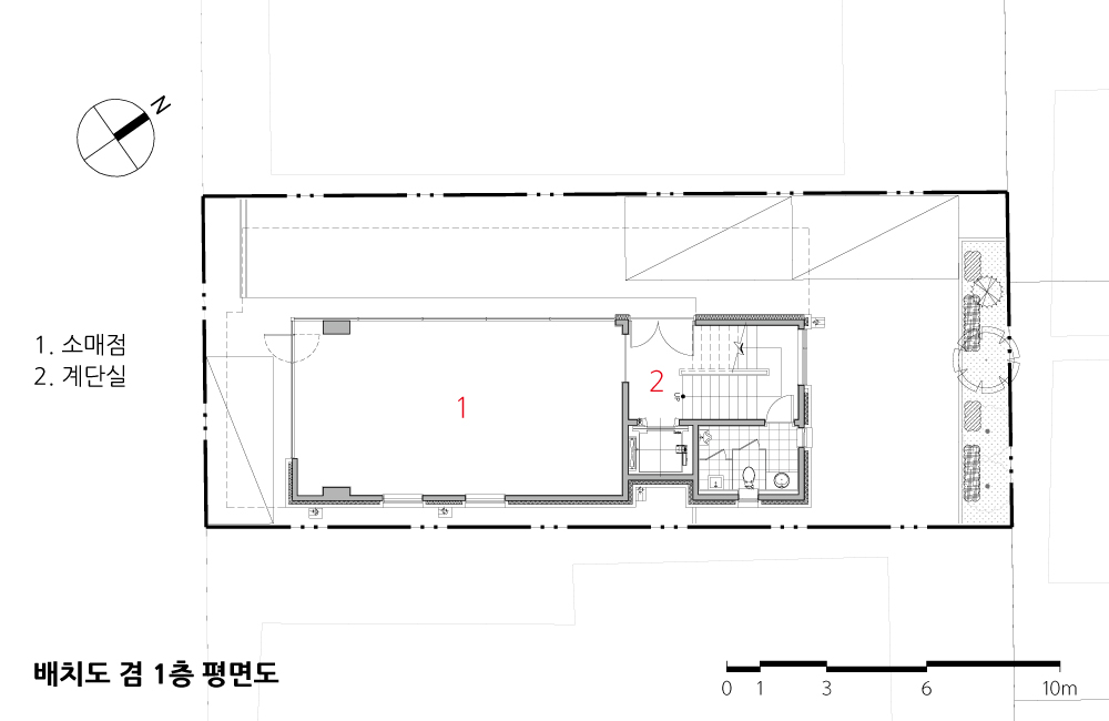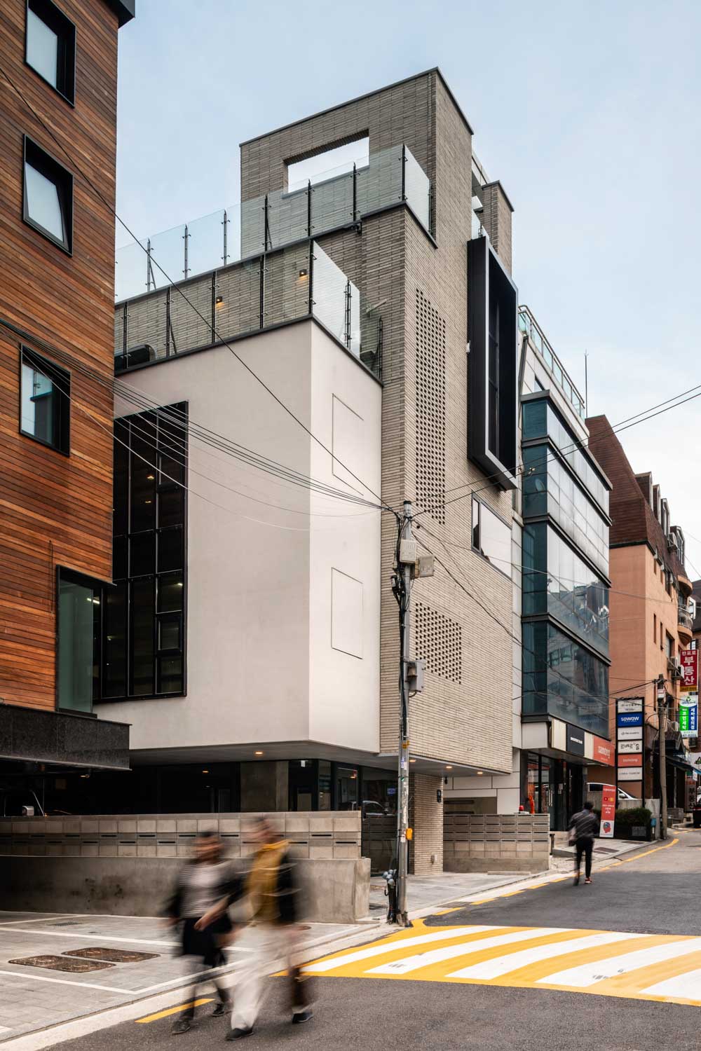 [잠원동 근린생활시설]은 주거(다세대)기능과 근린생활기능이 만나는 접점에 위치한다. 주거와 근린생활이 만드는 전형적 경관이 부딪히는 장소, 다양한 가면의 존재와 인정이 계획의 시작점 이었다. 강남(잠원동)의 가치가 생산한 욕망과 일방통행으로 적용되는 법규가 건축물의 매스를 재단하고 있는 현실 속에서 “주거와 상업의 접점”이라는 입지는 재료를 결정짓는 요인이다. 재료와 디테일이 얽힌 복잡한 주거경관과 변화무쌍한 기능을 포용하는 기능적 상업경관을 연결하는 역할로 벽돌을 선택하였다. 도시내 상업건물은 주체할 수없이 무질서한 간판이 입면이 되는 시대이다. 시간이 흘러도 지속가능한 입면을 위해 노출되는 정면 창호를 축소하여 의도치 않은 입면(창호간판 등)을 최소화 하였다. 채광, 환기의 창호기능은 유지하되 입면을 보전하는 부분적 이중외피를 제안하였다. 단순한 매스와 입면은 도시 가로경관의 여백이 되고, 복잡한 도시의 뒷 켜에 여백의 가면을 건축적 장치로 씌운다.
