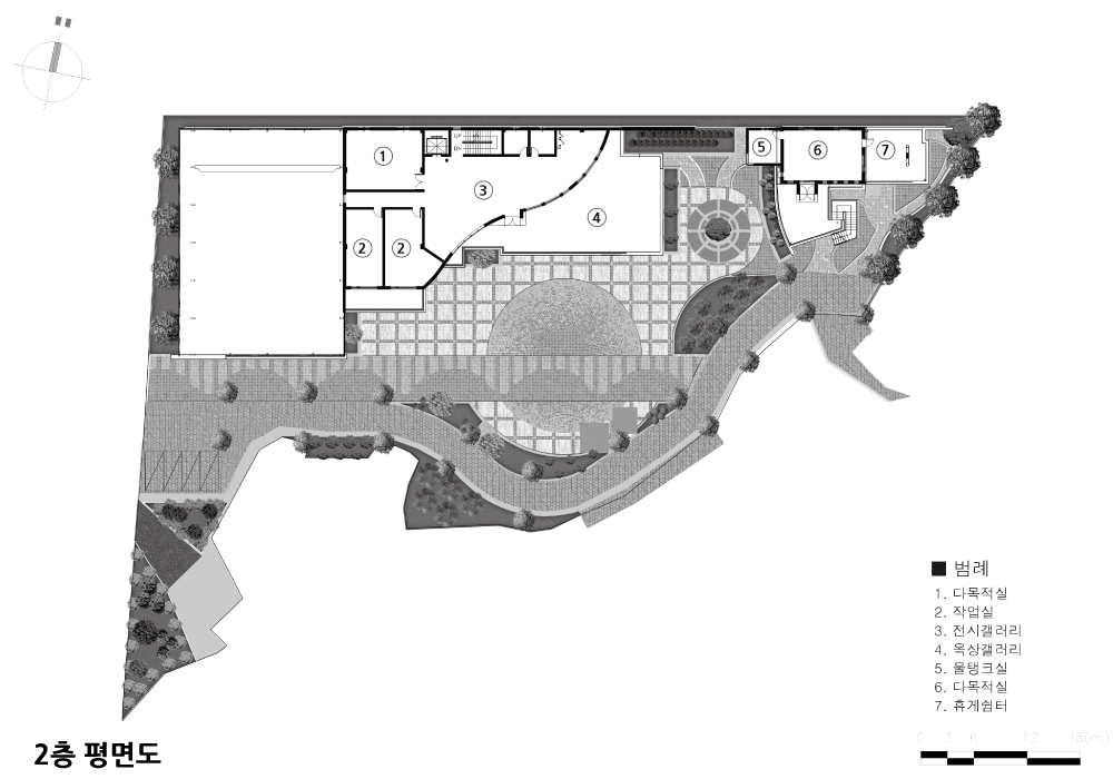 주로 기능적인 직선의 평면형 매스들 가운데 산허리를 돌아드는 마을의 배치형국에 순응하기 위해 예술촌 2층 갤러리공간 및 마을회관 좌측면 벽체에 곡면요소를 도입했다.
