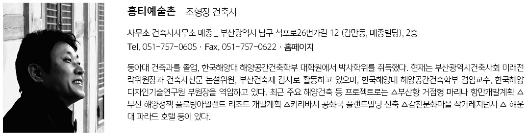 | 홍티 예술촌 설계자 | 조형장_건축사사무소 메종 건축주 | 부산광역시 사하구 감리자 | 건축사사무소 메종 시공사 | 성우종합건설 설계팀 | 최경호, 차주성, 박종석 대지위치 | 부산광역시 사하구 홍티로 78, 홍티마을 일원 주요용도 | 문화 및 집회시설, 노유자시설 대지면적 | 2,520.48㎡ 건축면적 | 1,158.54㎡ 연면적 | 1,580.23㎡ 건폐율 | 45.97% 용적률 | 62.70% 규모 | 지상 2층 구조 | 철근콘크리조 외부마감재 | 라임스톤, 실리콘계 플라스터 내부마감재 | 수성페인트, 라임스톤, 실크벽지 설계기간 | 2016. 06 ~ 2017 06 공사기간 | 2017.10 ~ 2018. 07 사진 | 윤준환 전문기술협력 - 구조분야 : TNP 구조기술사 - 기계설비분야 : 여명기술단 - 전기분야 : 여명기술단 - 소방분야 : 여명기술단 |