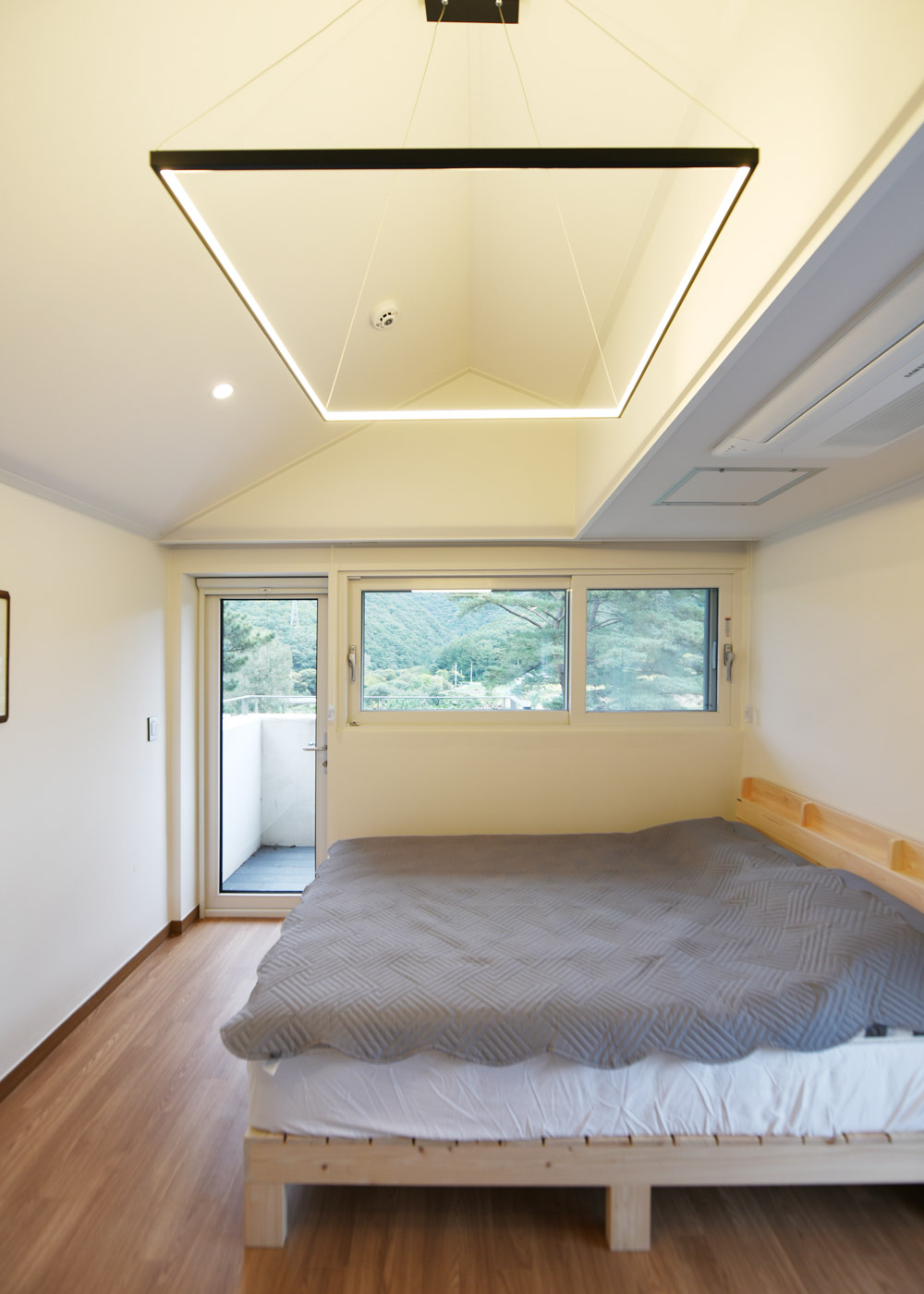 반면 소수의 이웃주택들이 위치한 서쪽 측면으로는 개구부를 최소화해서 사적 공간을 보호했다. 대신 동남쪽 측면에 커다란 개구부를 설치해 채광과 환기, 경관의 효과를 극대화했다. 또 입면을 고려해 솔리드와 보이드의 비례를 부여해 단편적 지루함을 해소시키고자 했다.